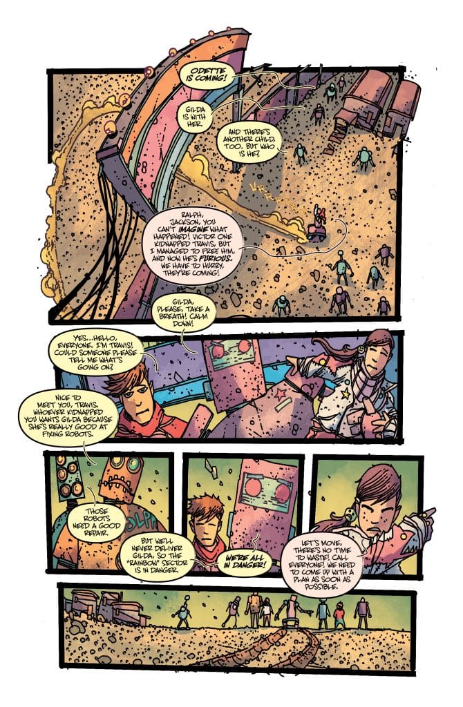 The robots from the “Dark Cage” and “Rainbow” Sectors come to blows in this final issue of Where Does The Rainbow End! Who will survive this final explosive confrontation, and will Gilda stay with her robot family or abandon them to join the rest of humanity?!