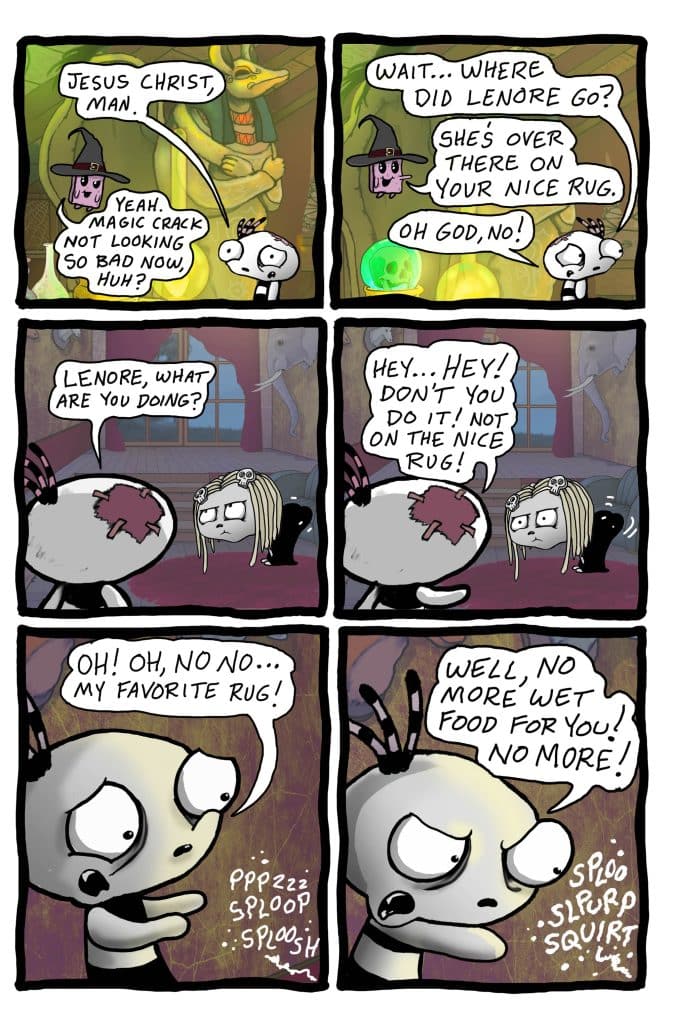 When Lenore’s cat battery runs down due to a lack of feline friends, an ancient Witch takes us on an origin story of Lenore’s history of cats, which holds the key to unlocking the truth about Lenore’s mom.