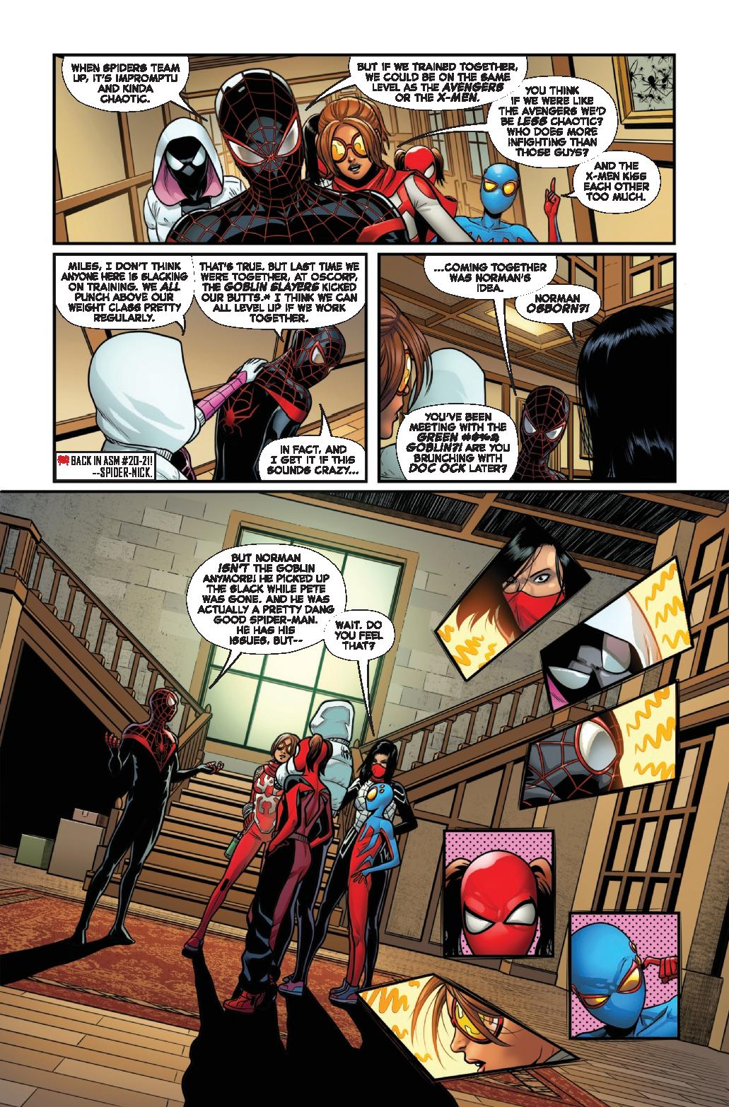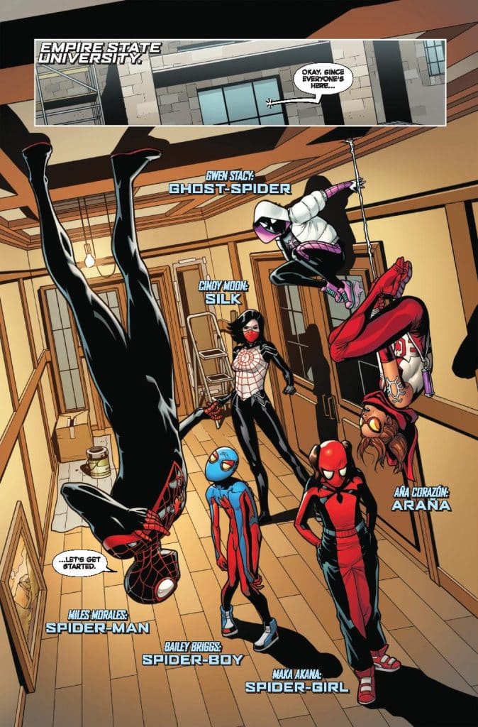 LEARNING TO CRAWL! Miles Morales, Spider-Gwen, Silk, Araña, Spider-Boy, and Spider-Girl have one thing in common — they aren’t ready. According to former Resolute Spider-Man Norman Osborn. So he and Spider-Woman are going to train them to meet the next threat — the only way the Green Goblin knows how. Because the next threat might well BE the Green Goblin!
