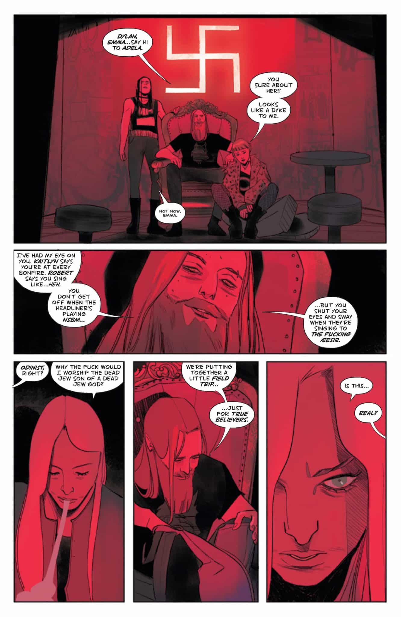 The new preview, sharing the beginning of Odin #1, starts with a visual punch: Odin disemboweled and disfigured, hangs from a tree, being pecked by a group of crows. The next pages offer a glimpse into the journey of journalist Adela, showing her infiltration of a Neo-Nazi punk band who are following a skin map to what they believe to be their promised land where they can rise to full white supremacist power. The series will follow in the frozen footsteps of thrill-seeking Adela as she ventures into the Norwegian forest with the Neo Nazi punks. But what awaits them in the woods is far older and stranger than any of them can comprehend, and no gods are coming to answer their prayers.