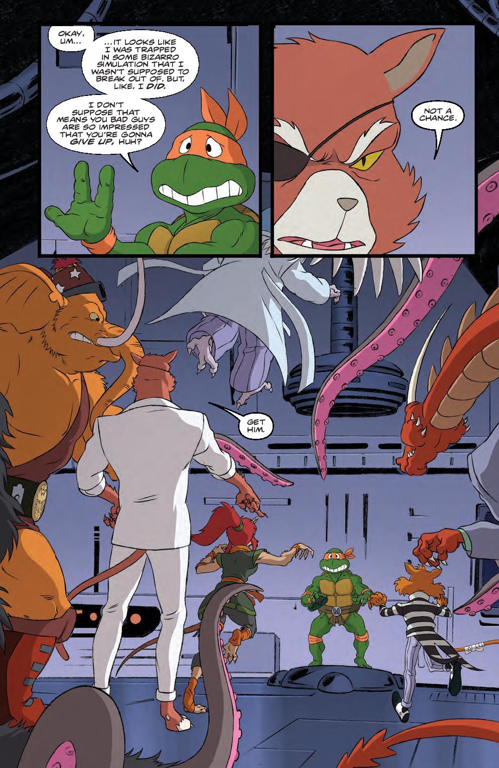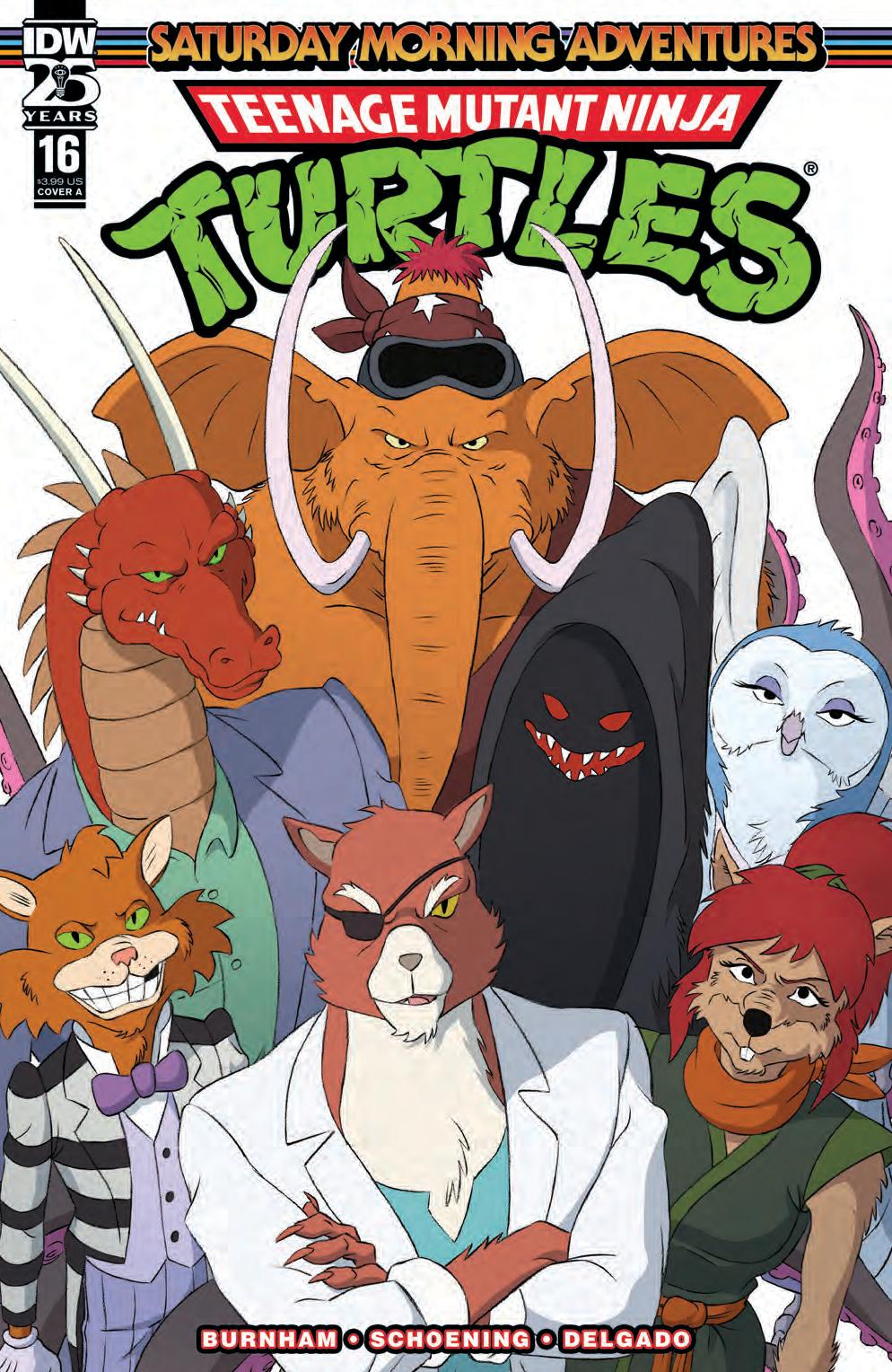 The universe’s greatest criminal organization has been made aware of a new planet to exploit: the primitive backwater known as Earth! Before the Pantheon can move in and start profiting, though, they must get the Teenage Mutant Ninja Turtles out of their way. Kidnapping and ensnaring the Turtles in a brainwashing simulation seems easy enough… until Mikey manages to break free. Now all he has to do is rescue his brothers from the Pantheon’s influence, figure out where they’ve been taken, and find a way to send these career criminals packing… No biggie, right? This is the end of the arc, so be sure you don’t miss the finale of the Pantheon’s introduction to Saturday Morning Adventures!