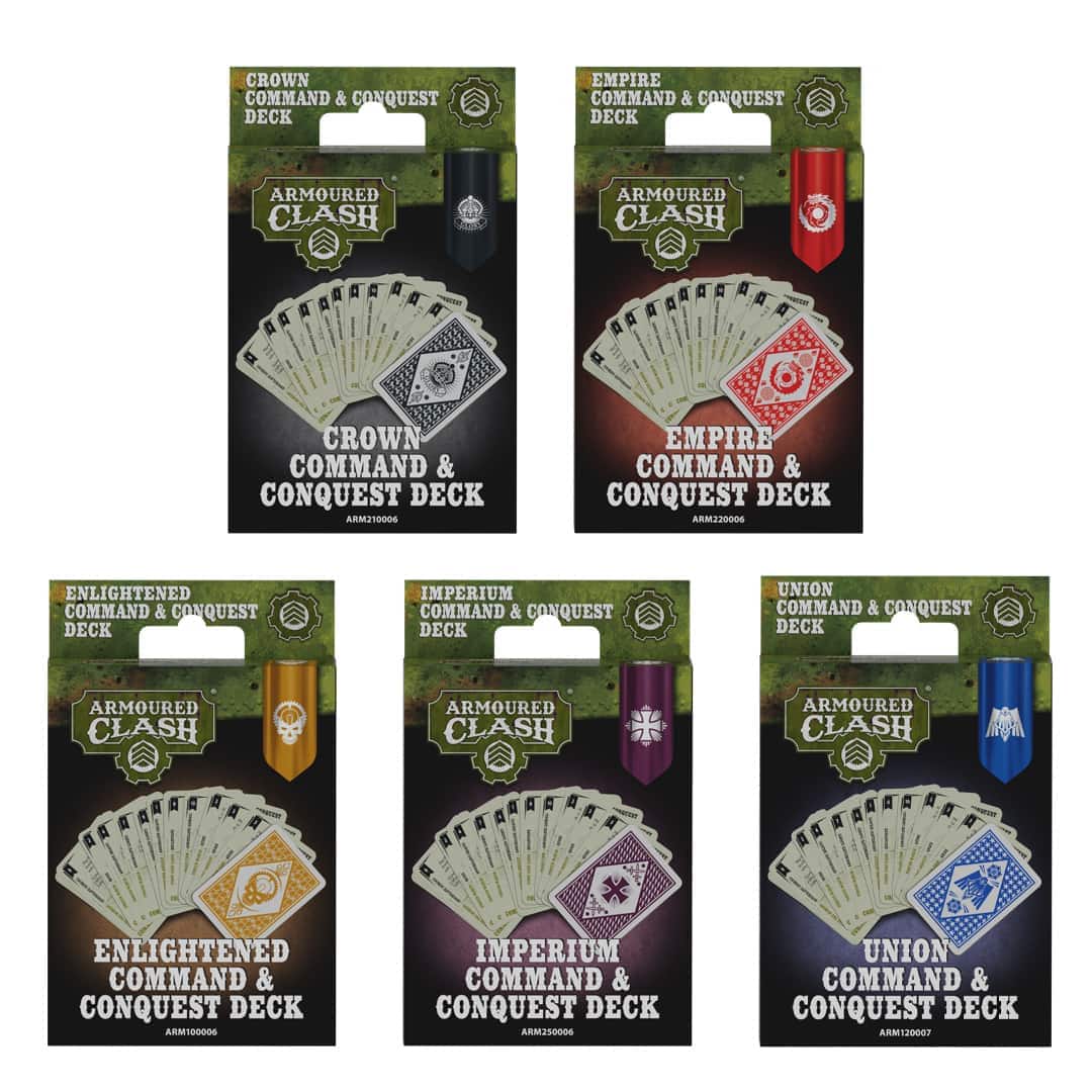 In games of Armoured Clash, these faction-themed cards allow players to issue Commands, claim Conquests, and score Victory Points. In short, they are a General’s key to victory. But use them wisely. For your enemy will have these same tools at their command.