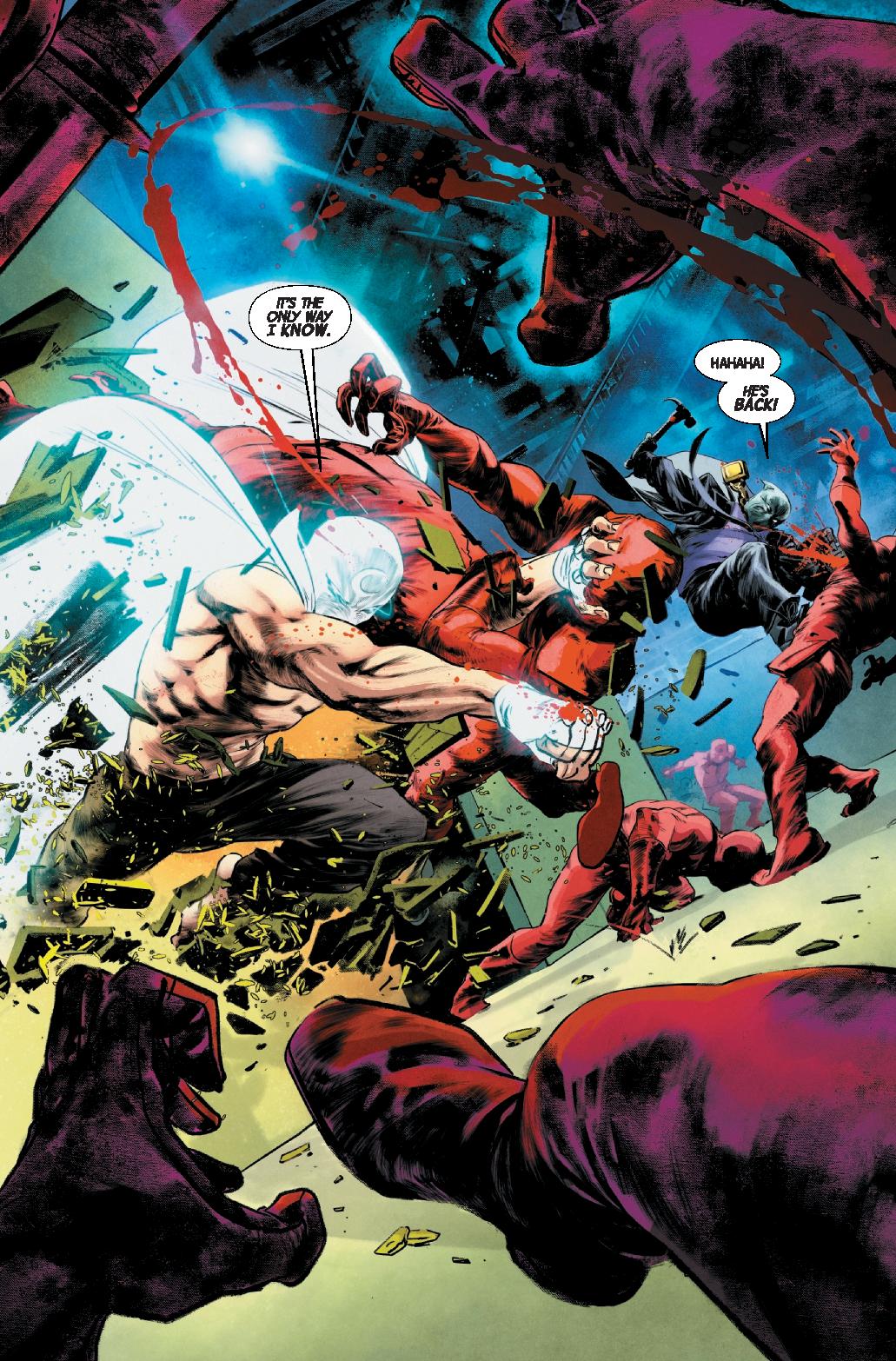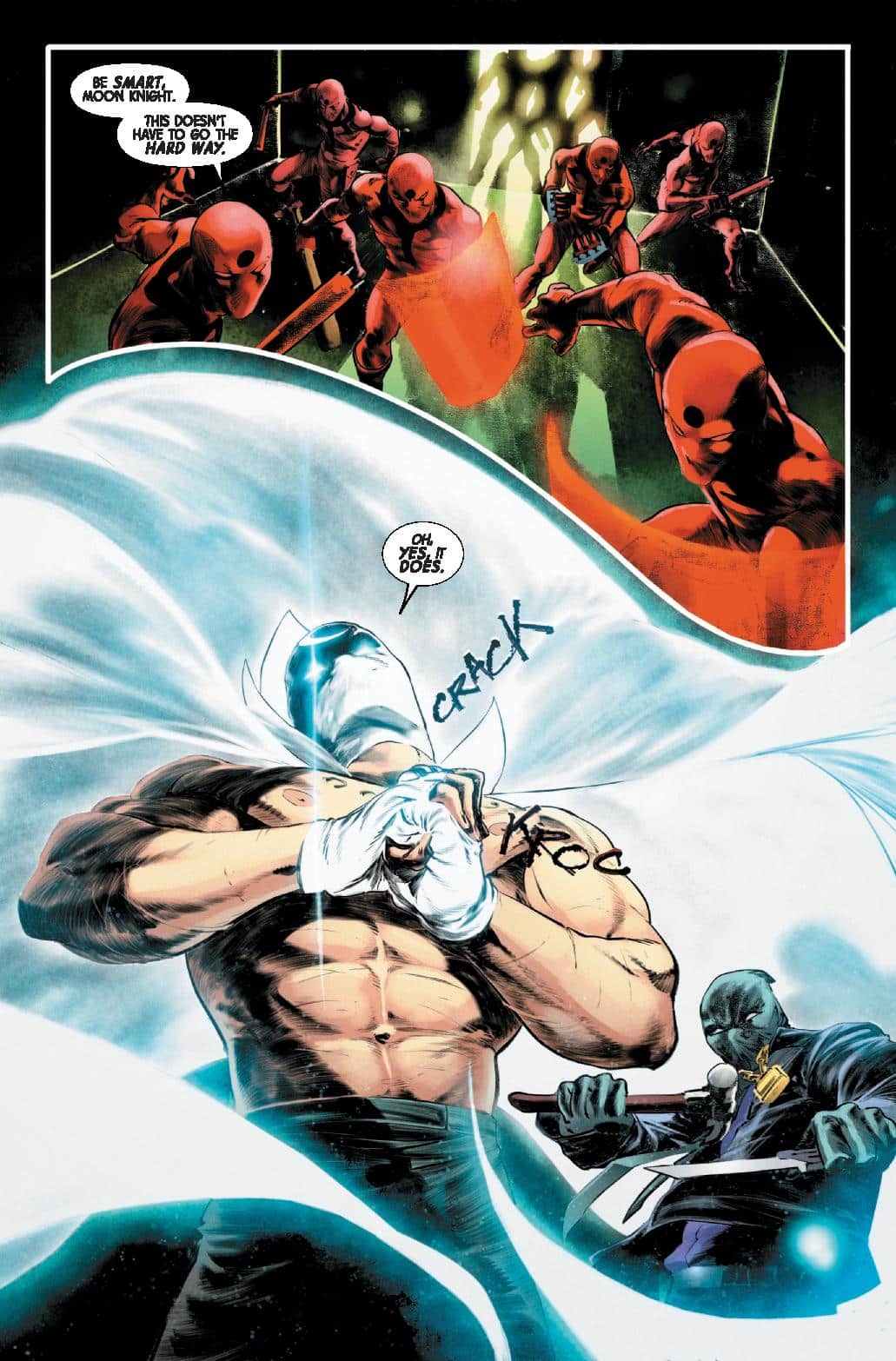 TRAPPED?! Wounded like a wild animal in a trap, Marc Spector A.K.A. MOON KNIGHT lashes out! In league with MR. FEAR, Marc’s oldest foe, BUSHMAN, has returned and intends to extract a VITAL piece of information from Moon Knight’s fractured psyche! But ZODIAC, the most recent deranged madman obsessed with Khonshu’s avatar, has plans all his own for Marc Spector… and a box-cutter to help him stage a brutal and bloody escape!
