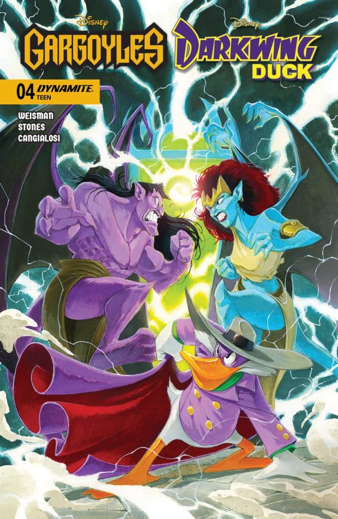 POP GOES THE WORLD! Time has run out for the stalwart champions of New York City and St. Canard, as Demona unleashes the diabolical Paddywhack from his jack-in-the-box confinement and directs him to destroy all of humanity — and all of duckdom as well, just for good measure! Can Goliath and Darkwing hold Paddywhack at bay long enough for reinforcements to arrive in the form of Gosalyn, Launchpad, Morgana, and the rest of Manhattan Clan? And even if they do, will all of their combined strength be enough to overcome Demona’s Quackronomicon-enhanced chaos? Find out in the explosive finale that is Gargoyles/Darkwing Duck #4 — energetically encoded by creative companions GREG WEISMAN, TAD STONES, and CIRO CANGIALOSI, with properly portentous covers provided by STONES, CANGIALOSI, CARLO LAURO, and IVAN BIGARELLA!