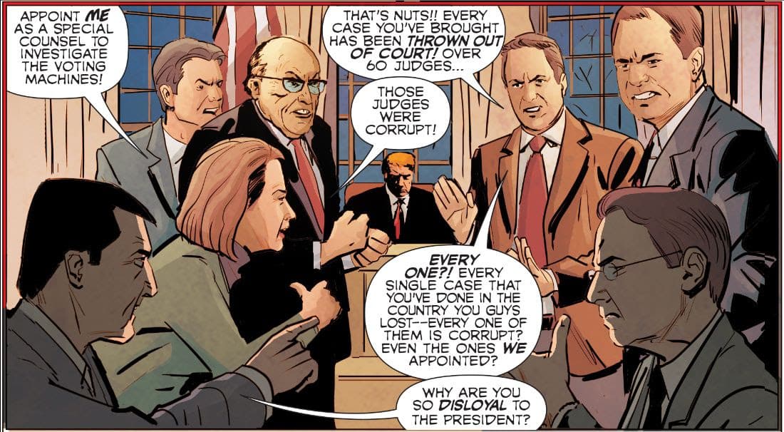 In the final volume of this provocative series, our heroes lead a Democracy movement to resist the authoritarian Regime while debating the more perfect union that might replace it. Can they rise above their differences to prevail against violent repression, inner demons and, at times, each other? 1/6: The Graphic Novel asks and answers the question: what if the January 6, 2021 Insurrection had been successful? In an entertaining, chilling, and sometimes humorous form, 1/6 is a tale of authoritarian rule in the United States and a struggle for Democracy. Harvard Law School Professor Alan Jenkins and New York Times bestselling graphic novelist Gan Golan have teamed up with veteran comic book artists to depict in stunning detail what the Insurrectionists and their allies had planned on that day, the threats to our democracy that remain, and what can be done about it. Issue #2 through #4 include free access to both an Action Guide and a Curriculum Guide for Teachers and Community Leaders.