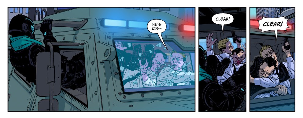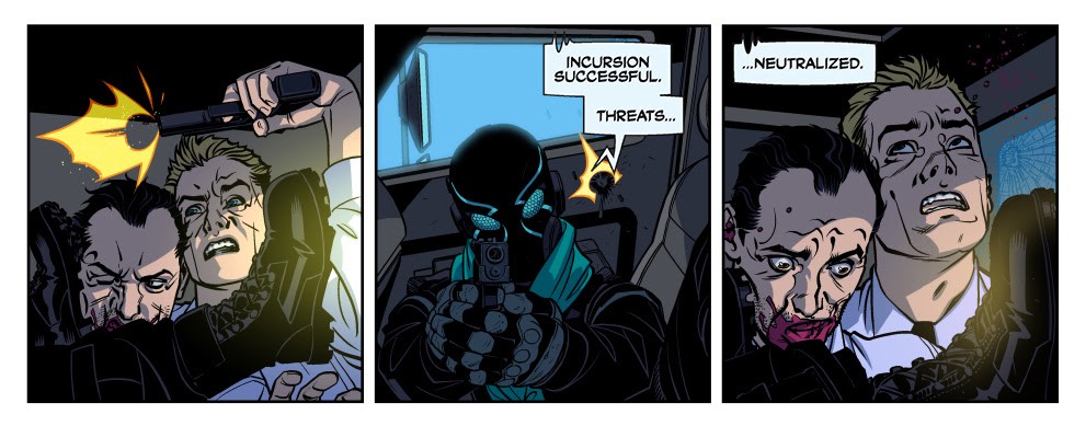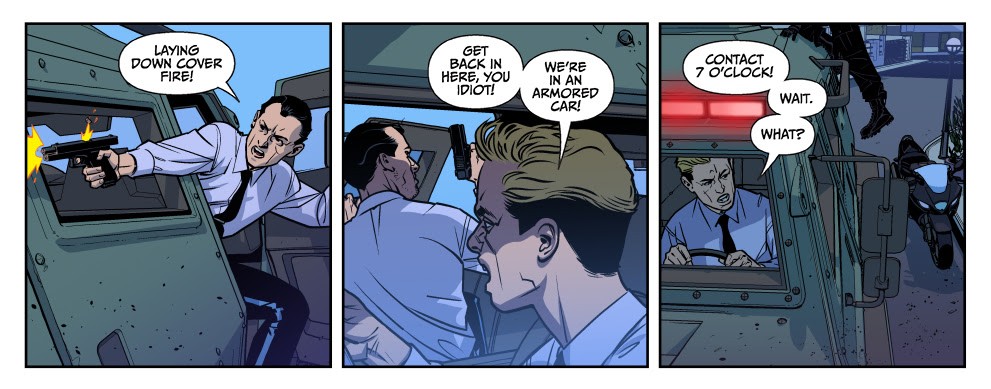The comic roots those weighty themes in pure, relentless action—an approach both Stelfreeze and Wagner honed together on titles such as The Ride and Gun Candy. But the creative team deviates from standard cinematic fare by adding an autobiographic element to River’s identity.