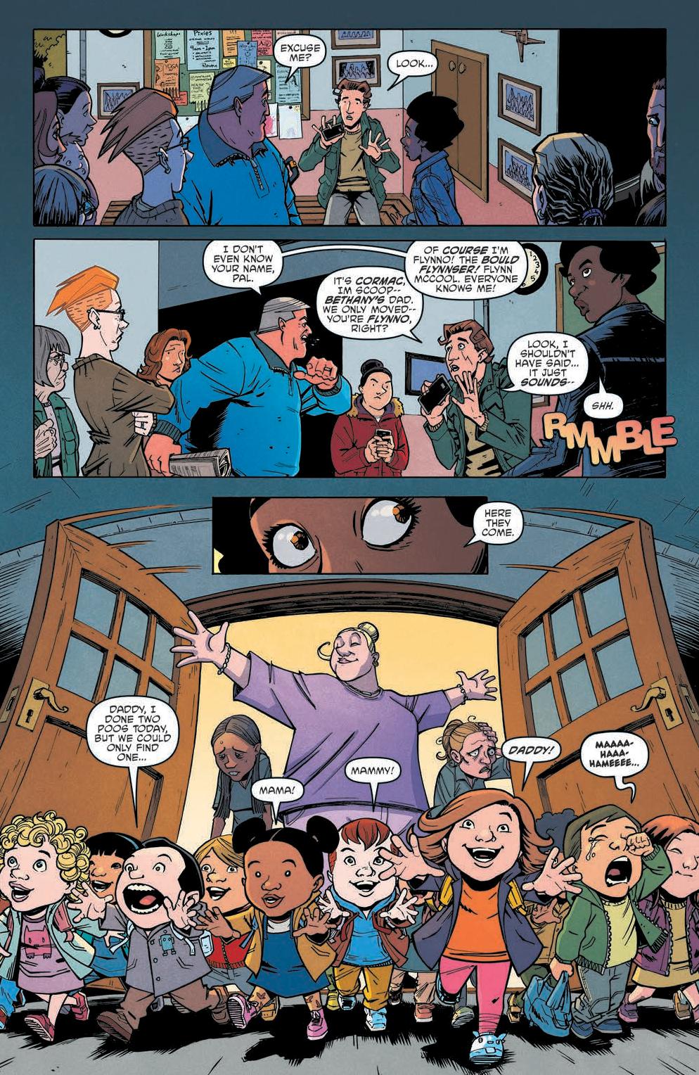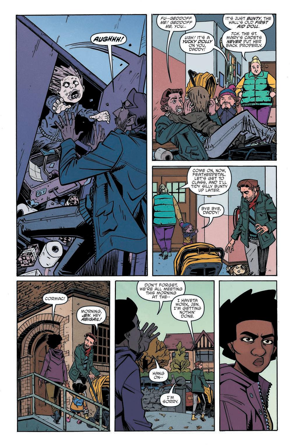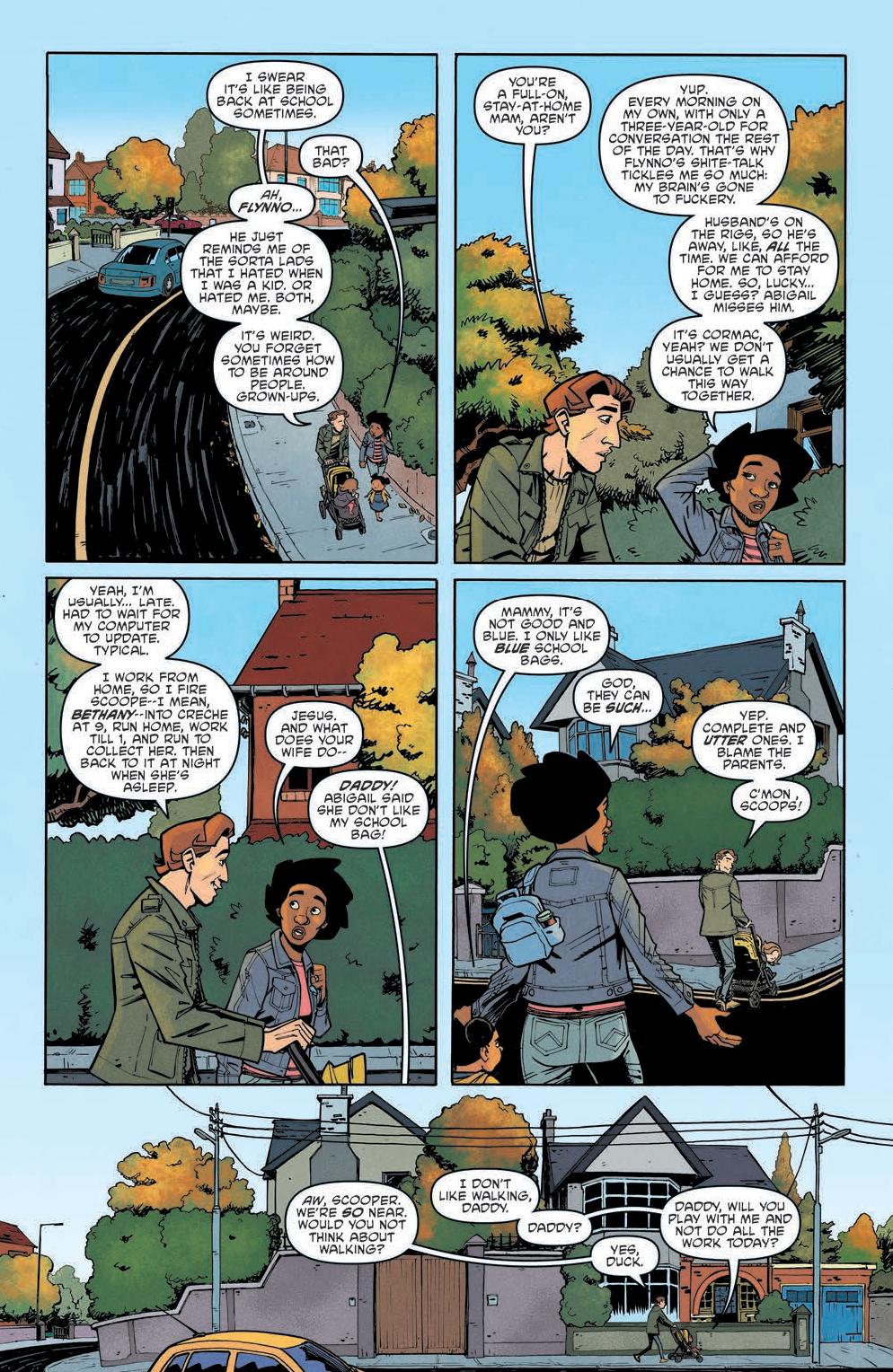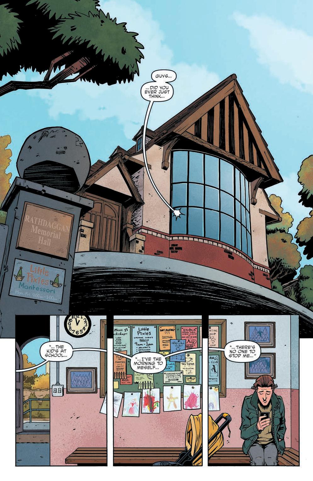 The comic focuses on a group of parents, Jen, Cormac, Rhona, and Flynno, as they commiserate over what they will do when they don’t have their kids. From there the story spirals into an investigation concerning the schoolhouse the kids go to. Scarenthood delivers a flipped dynamic of what we’d expect. Instead of the kids investigating the haunting and what goes bump in the night, it’s the parents while the kids are away.