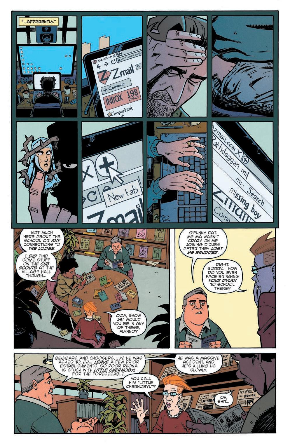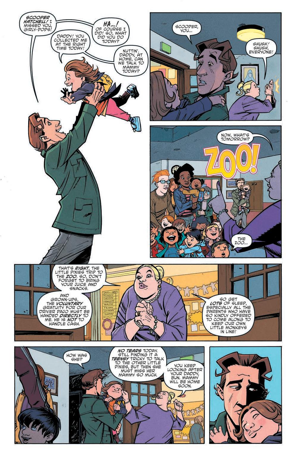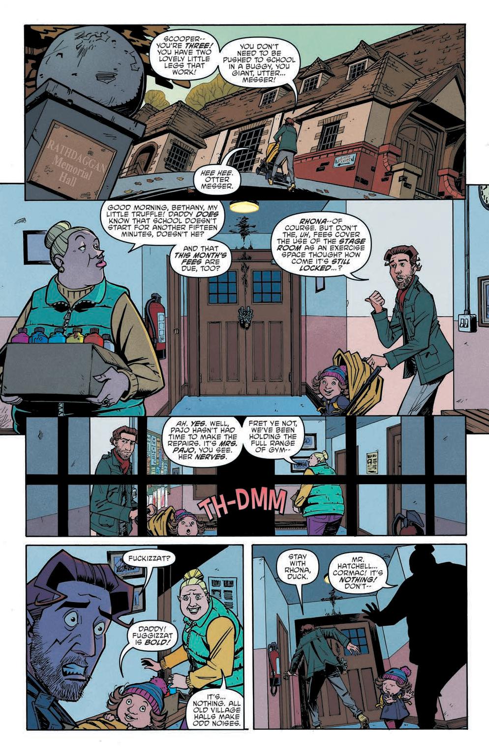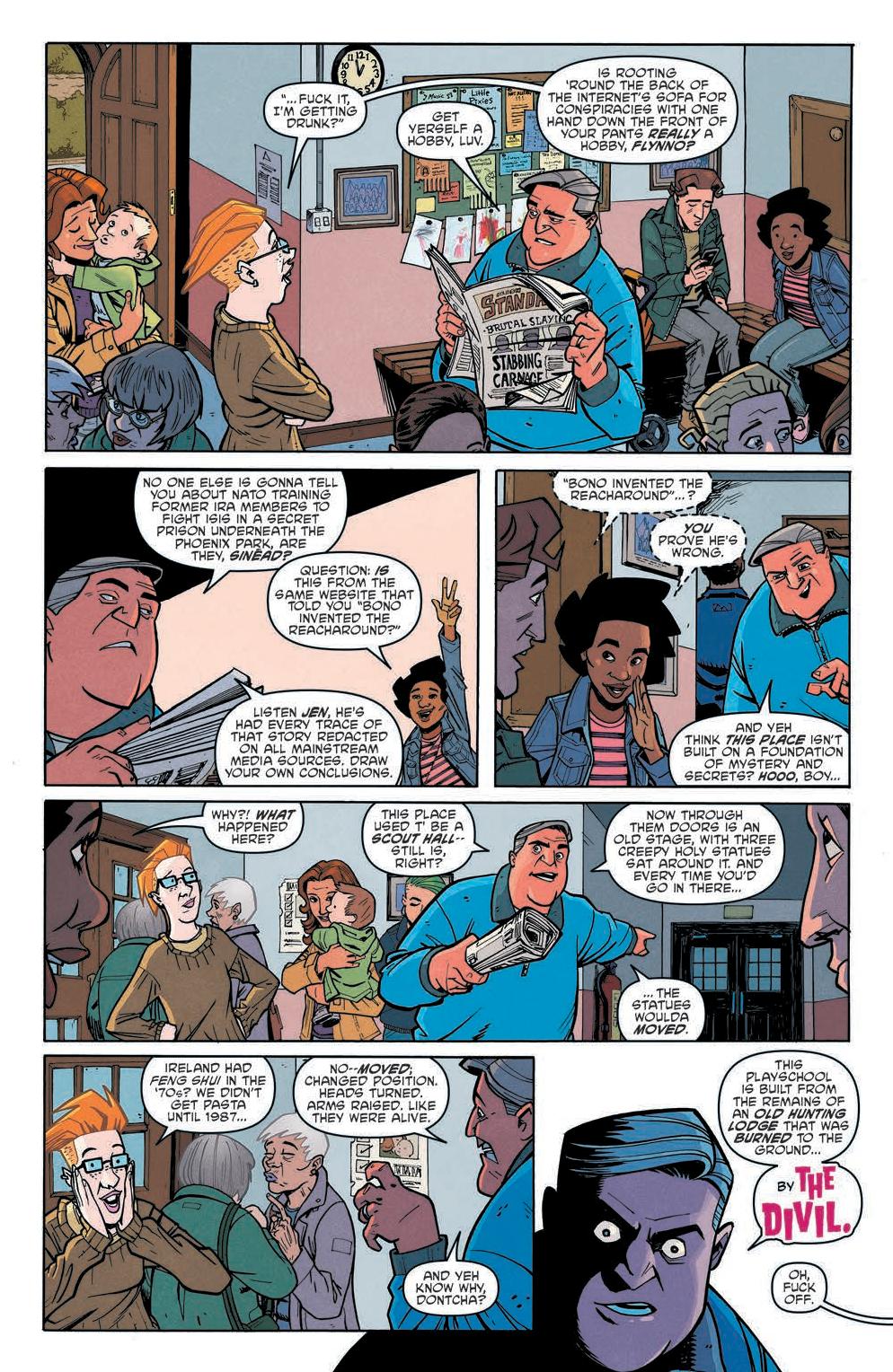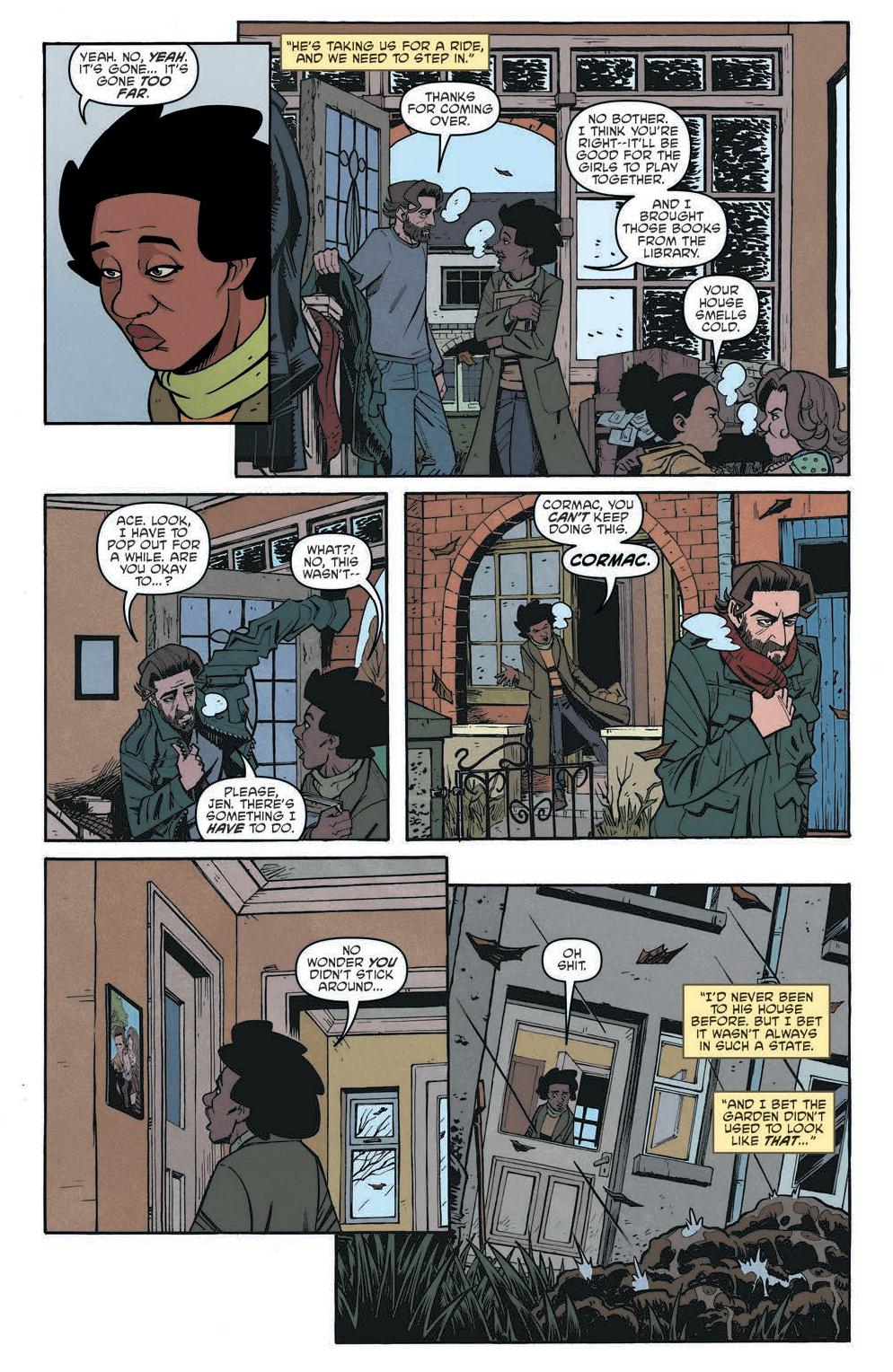The comic focuses on a group of parents, Jen, Cormac, Rhona, and Flynno, as they commiserate over what they will do when they don’t have their kids. From there the story spirals into an investigation concerning the schoolhouse the kids go to. Scarenthood delivers a flipped dynamic of what we’d expect. Instead of the kids investigating the haunting and what goes bump in the night, it’s the parents while the kids are away.