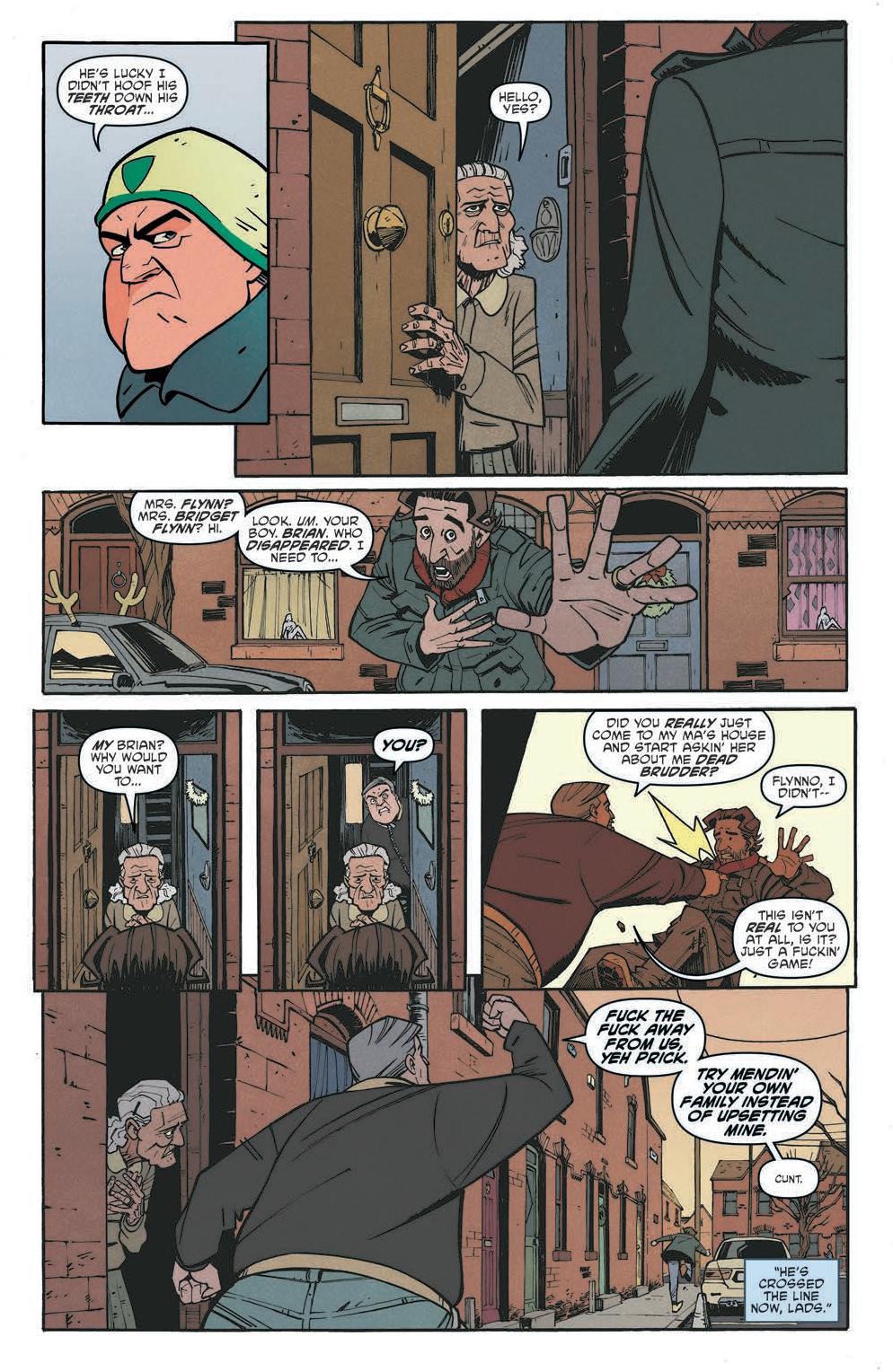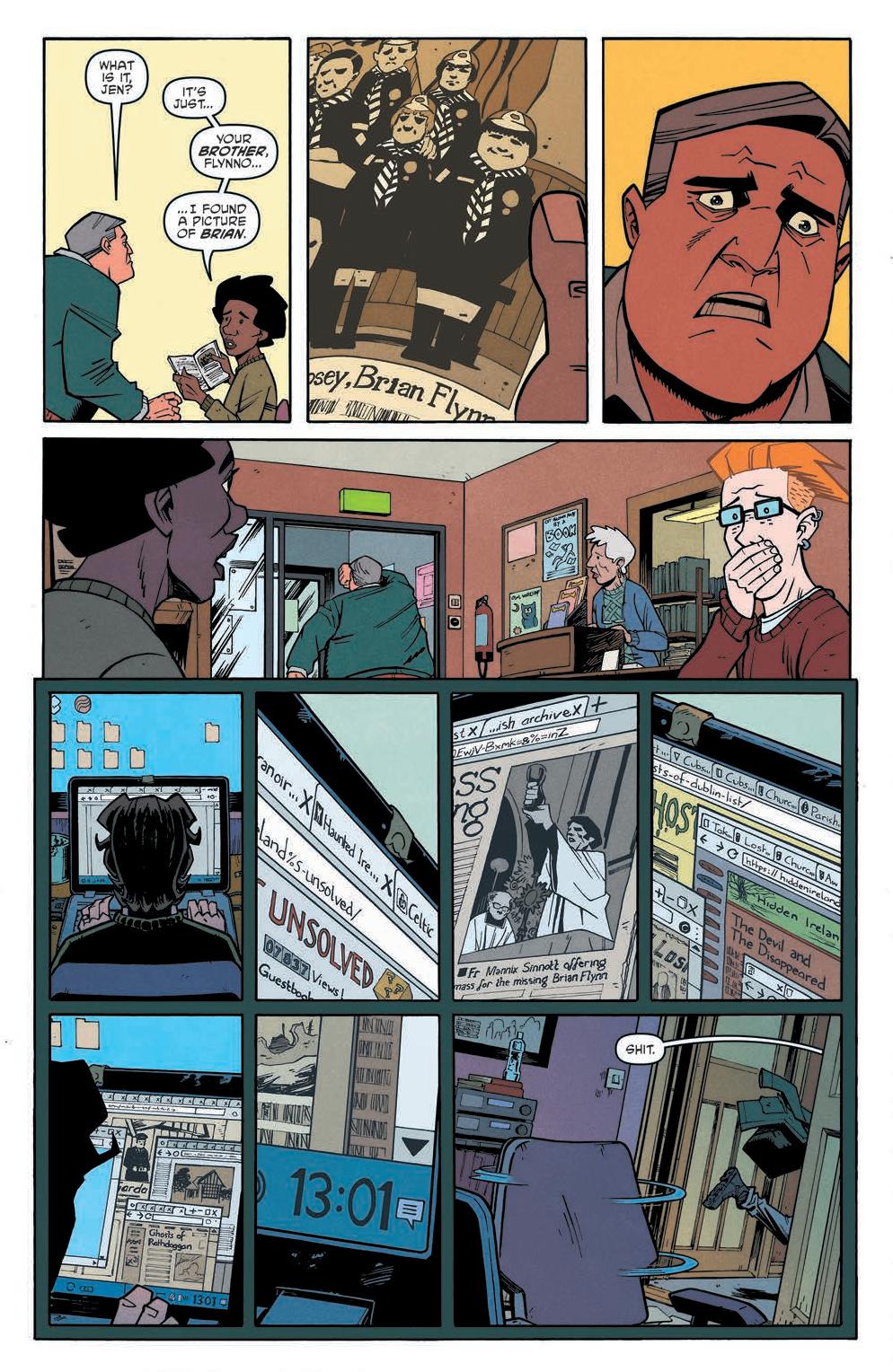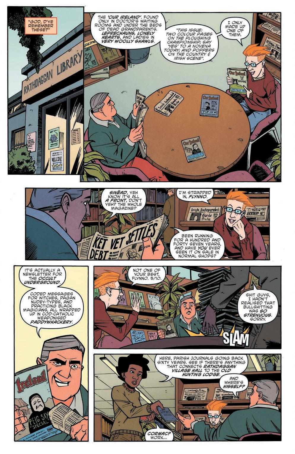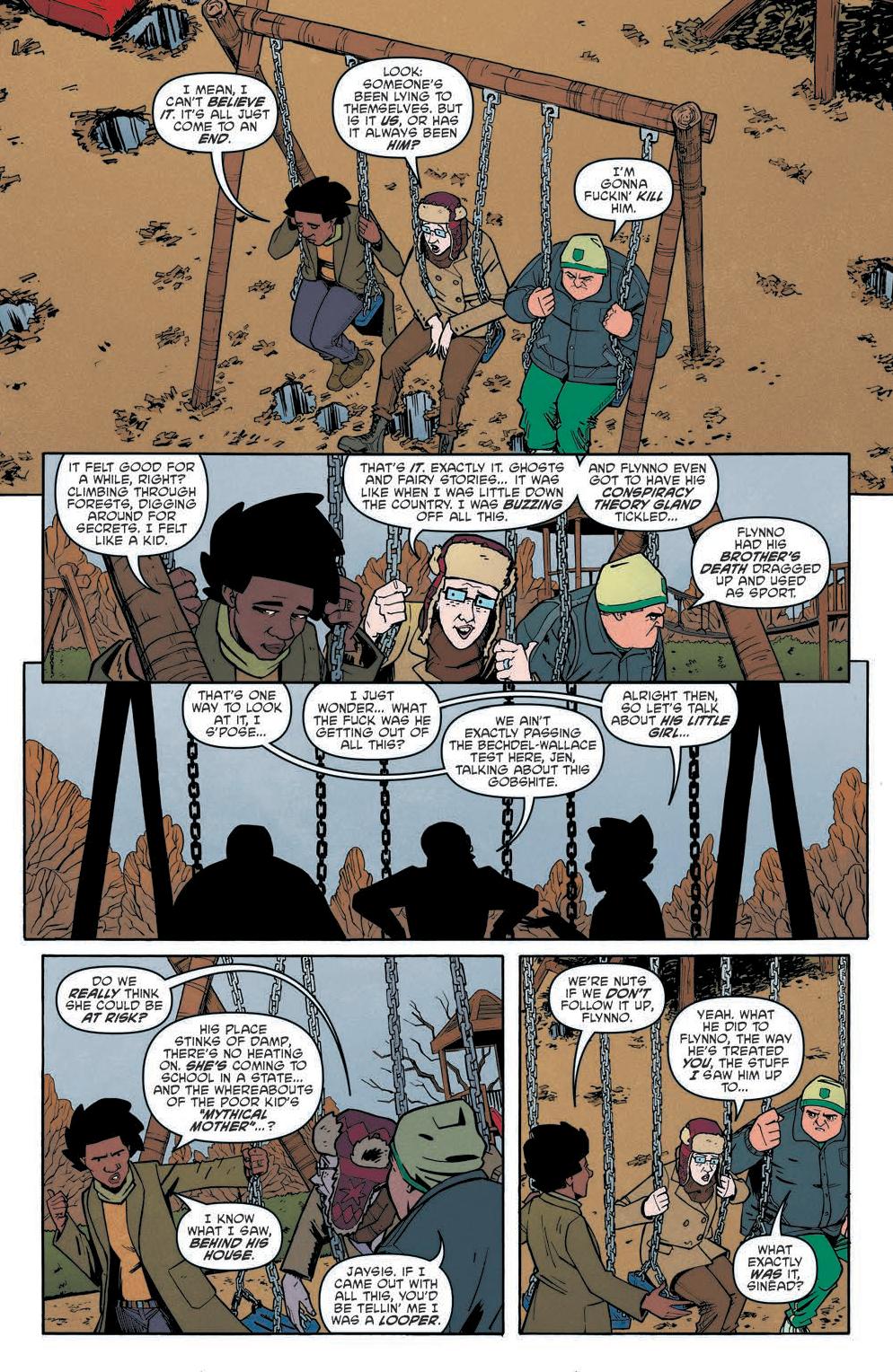 The comic focuses on a group of parents, Jen, Cormac, Rhona, and Flynno, as they commiserate over what they will do when they don’t have their kids. From there the story spirals into an investigation concerning the schoolhouse the kids go to. Scarenthood delivers a flipped dynamic of what we’d expect. Instead of the kids investigating the haunting and what goes bump in the night, it’s the parents while the kids are away.
