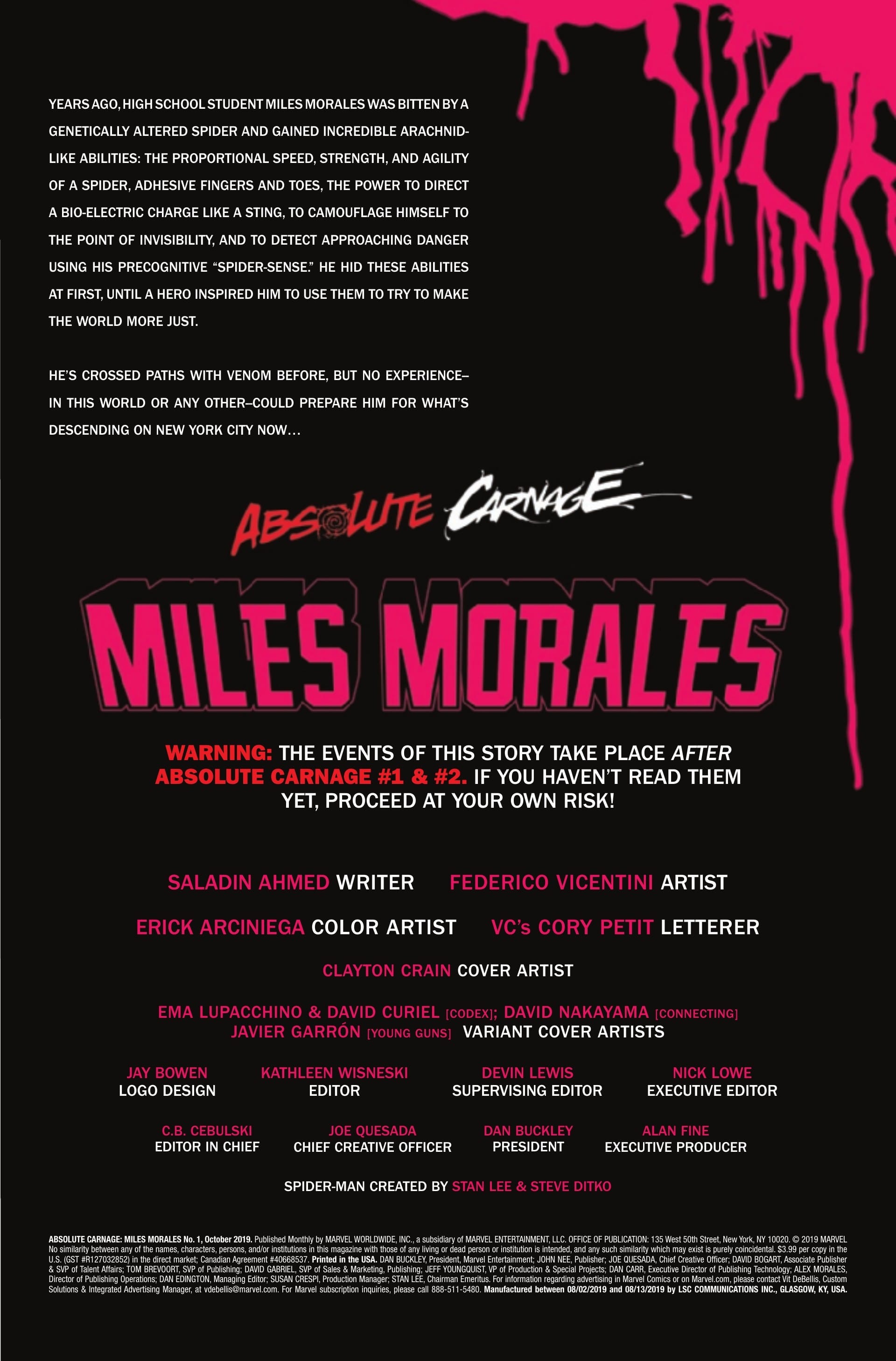 It’s business as usual for Miles Morales as he finds himself squaring off with Mac Gargan, A.K.A. THE SCORPION! But as a cult of Carnage’s bloodthirsty acolytes swarms New York, Miles will learn the hard way that Scorpion has a history with Venom and the other symbiotes of the Marvel Universe! If he can survive this issue, that is.
