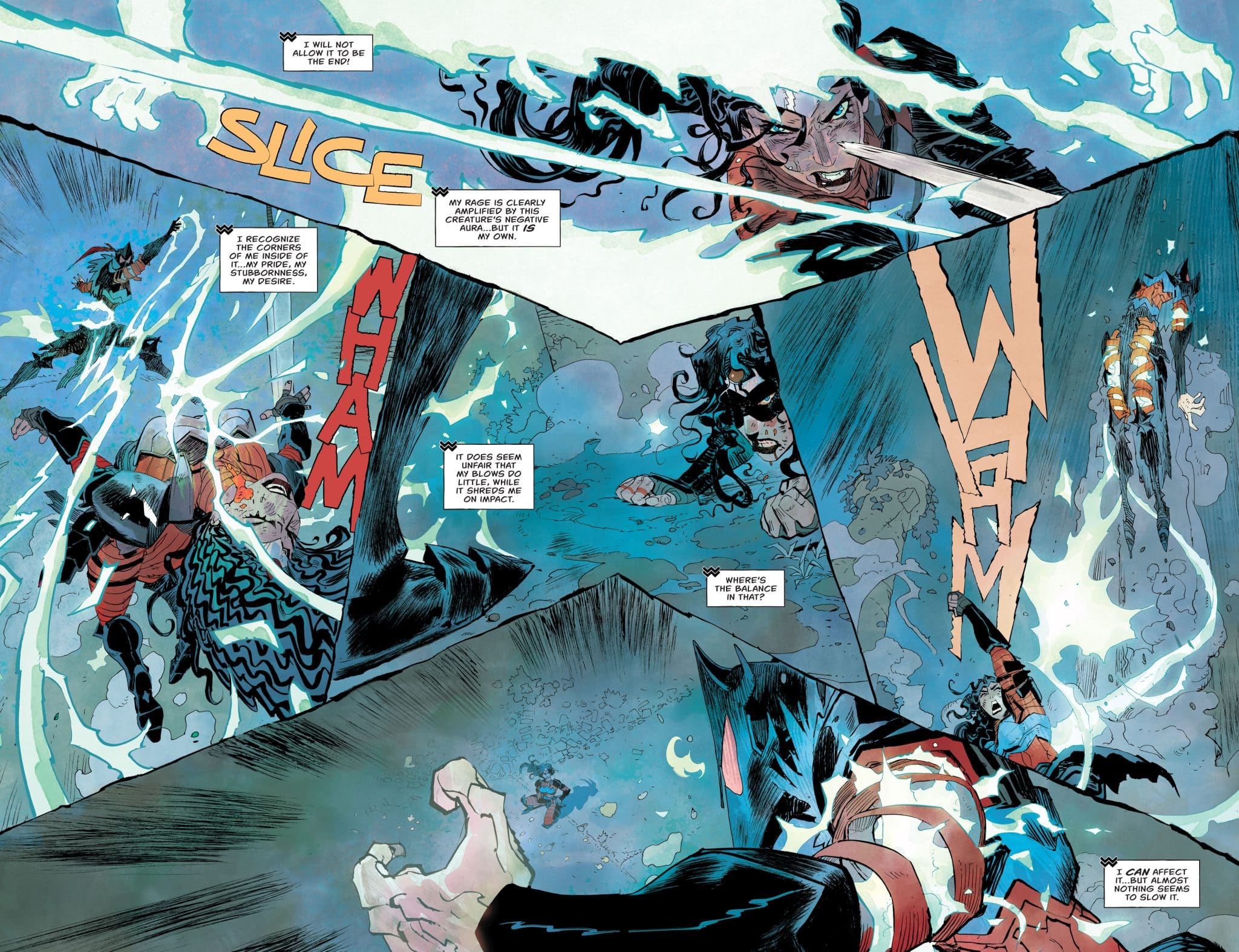 Absolute Wonder Woman #14 (DC) – The two-parter about Diana fighting her dark double comes to a literally earth-shattering conclusion courtesy of Kelly Thompson, Matias Bergara, and Jordie Bellaire. Bergara is no mere fill-in artist, and he throws some beautiful, primal shapes with his layouts matching a conflicted color palette from Bellaire and painful narration from Thompson. And, on the bigger picture side of things, Absolute Wonder Woman #14 shows there is something askew and dark about the Absolute Universe, which makes heroes like Diana all the more needed. Kelly Thompson have built the foundation for a heroic, yet hellish take on the iconic superhero, and a crossover is additive to the narrative not a chore. And to wrap up, Absolute Zatanna and Jordie Bellaire’s glittering colors for her almost run away with the whole issue in a gnizilatnat esaet. Overall: 8.7 Verdict: Buy