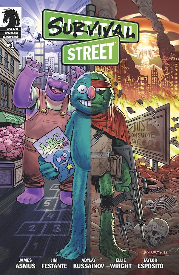 A candy coating of pop culture madness, humor, and cartoonishly absurd hyper-violence is heading to comic shops soon with Survival Street from Dark Horse Comics! Dashed with just enough hope to keep you holding on, Survival Street is an action satire written by five-time Harvey Award nominee James Asmus and Jim Festante, drawn and inked by Abylay Kussainov, colored by Ellie Wright, and lettered by Taylor Esposito.