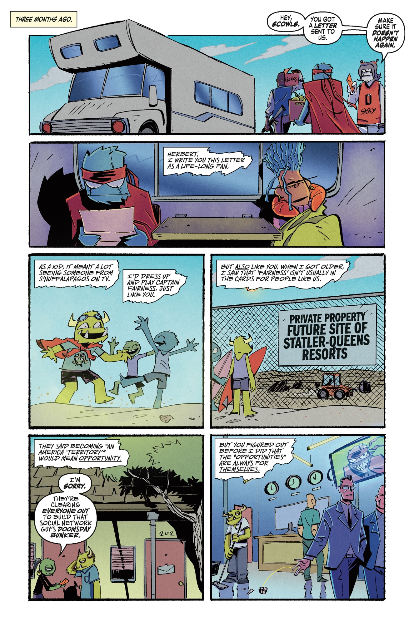 After America is sold off to private companies, this A-B-C-Team of ex-entertainers rescues kids from cruel company towns. But Portland can’t hold everyone they rescue, and the cracks are about to break… Prepare for a radical departure in the series.