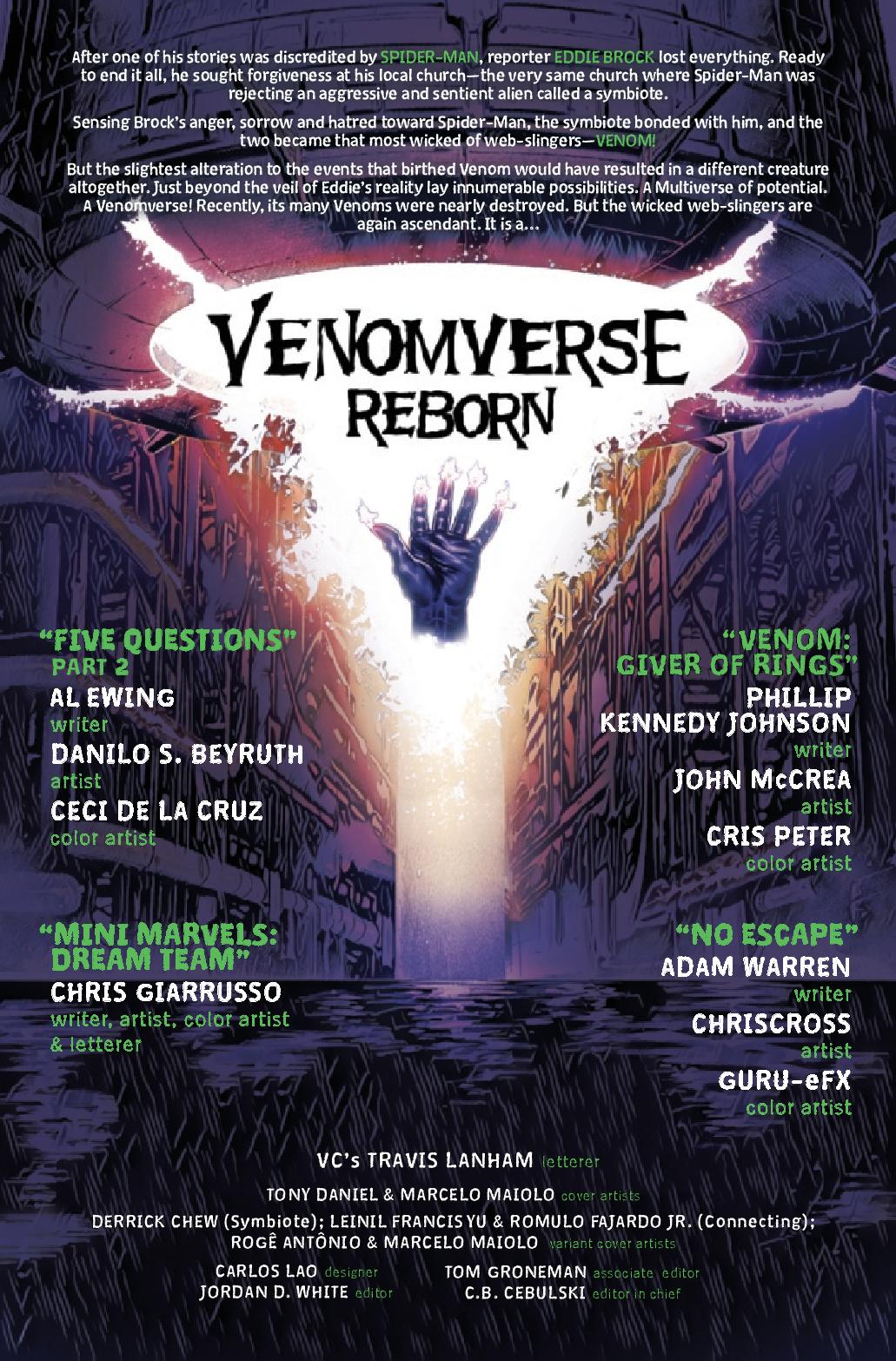 In Venomverse Reborn #2, Phillip Kennedy Johnson and John McCrea bring a brutal take on Venom born in the age of Vikings! Then, from Adam Warren and Chriss Cross comes the return of the final biological life in his universe, the Venom of Venom: The End! Plus, Chris Giarrusso returns with a tale of Mini-Marvels Venom! Also featuring a cover by Tony Daniel.