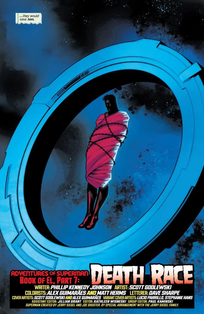 Superman returns! Fan-favorite Future State: Superman: House of El creators Phillip Kennedy Johnson and Scott Godlewski reunite for Adventures of Superman: Book of El! As the Super-Family settles into a well-earned time of peace, a powerful ally-turned-enemy invades Earth with an army at his back and a god-aspect of Olgrun, mad god of the First World. When even the Super-Family lacks the power to stop him, Superman is sent against his will to a place even he’s never been…where he’ll find allies he could never have expected. Concluding the events of Future State and Phillip Kennedy Johnson’s Action Comics, the next epic adventure begins here!