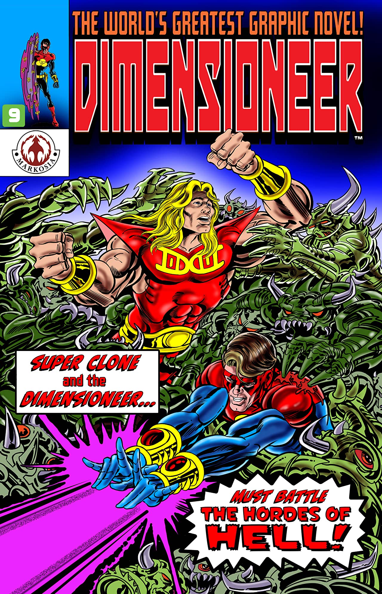 Introducing into the Dimension’s Universe…. Super Clone! A hero that will be unlike anything you’re ever seen! This startling issue has battles galore as the Dimensioneer teams up with a soul who has been trapped in the Hell Dimension for untold years… his body being ripped to shreds by hoards of flying demons and then reformed…. only to have the same unholy thing happen over and over again!