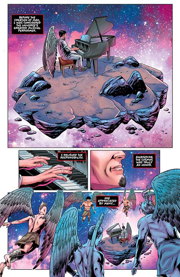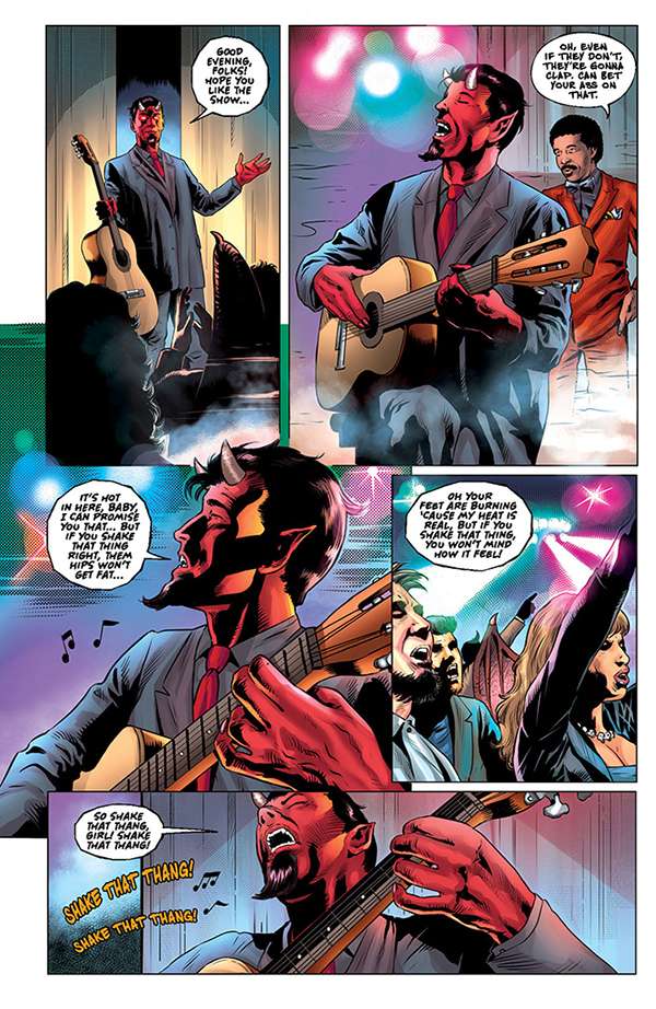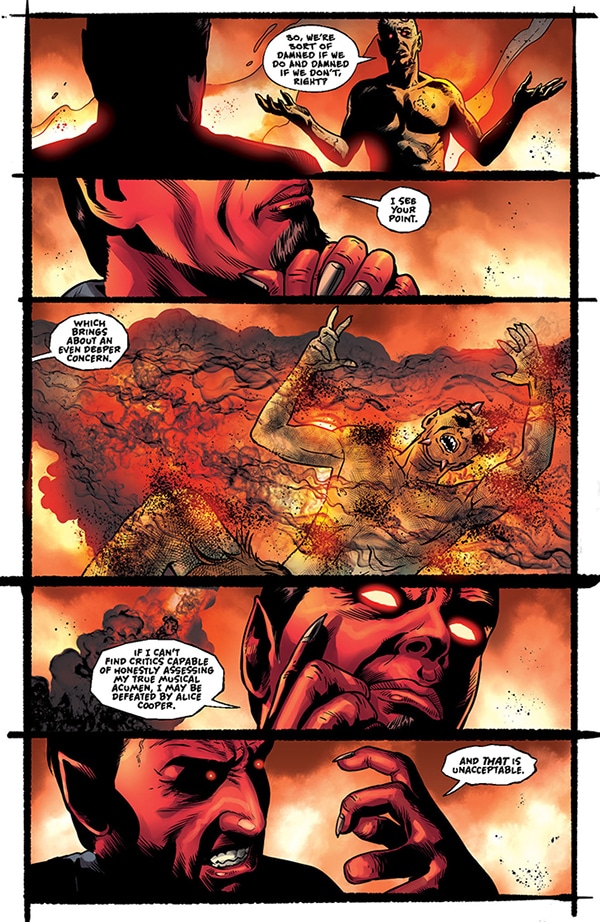 Gabriel tells him there’s a great music club called Burning Meat where the souls of legendary musicians hang out, watching the headliner — Lucifer — play his own personal style of rock music to the raucous applause of the demons in attendance. Now, Lucifer wants to take the show to Earth and the only thing stopping him is… Alice freakin’ Cooper!