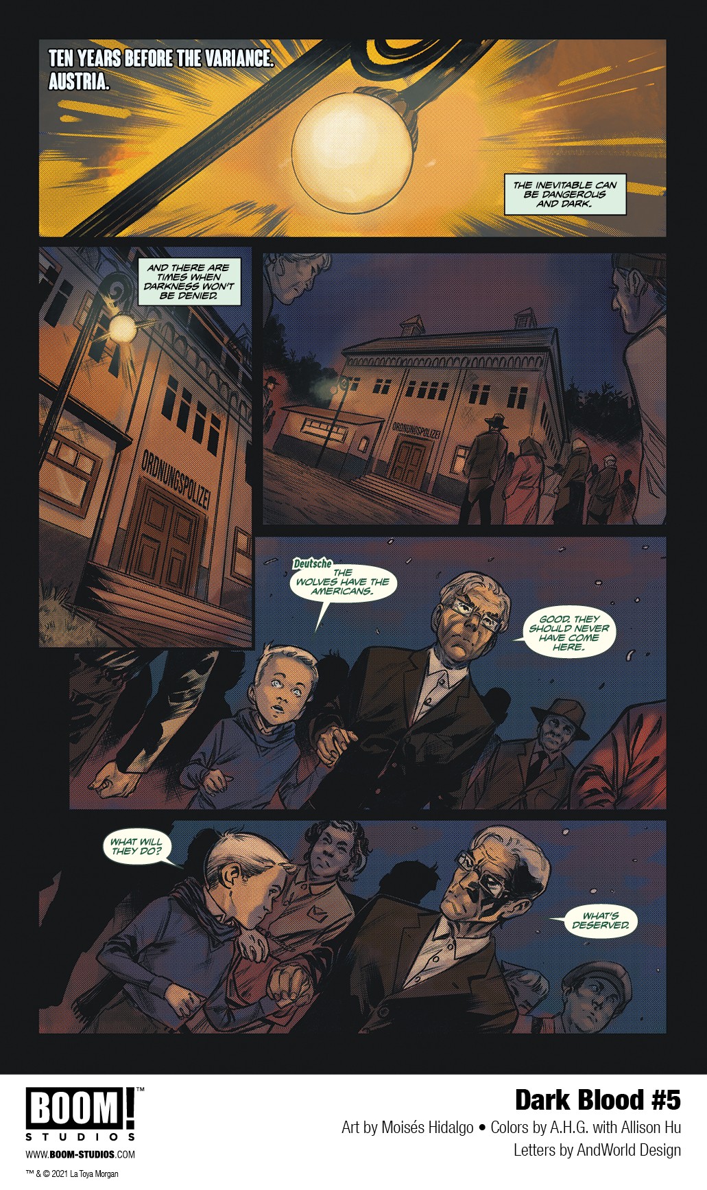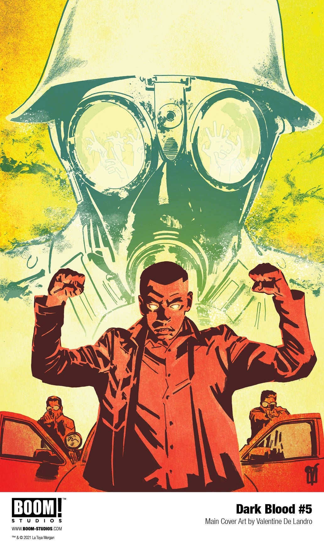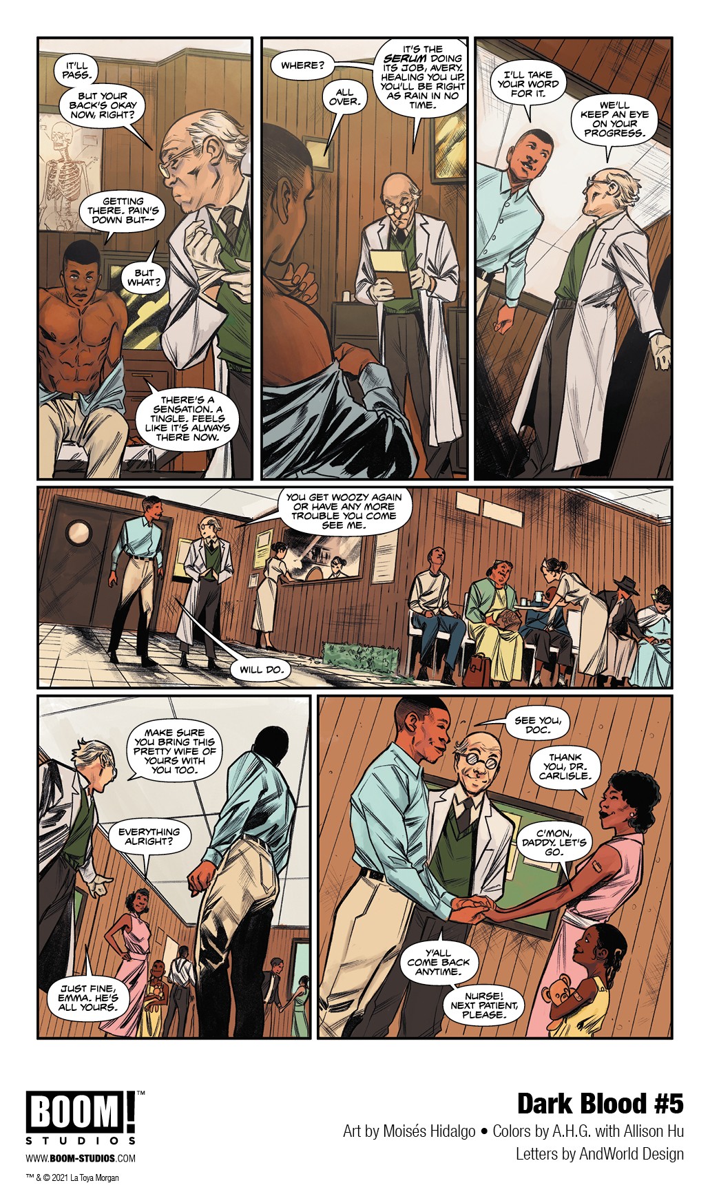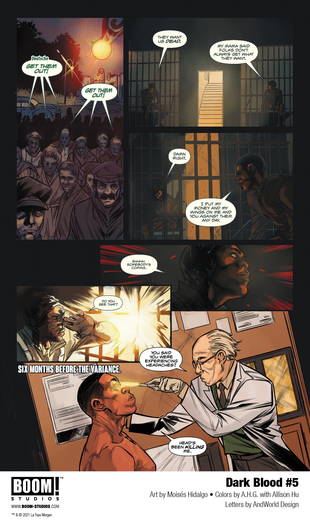 BOOM! Studios has revealed a first look at Dark Blood #5, the penultimate issue of an evocative new six-issue original series from screenwriter LaToya Morgan, rising star artist Moisés Hidalgo, colorists A.H.G. with Allison Hu, and letterer AndWorld Design, about a young man forging a brave new future for himself and his family while dealing with his past, available on December 1, 2021.