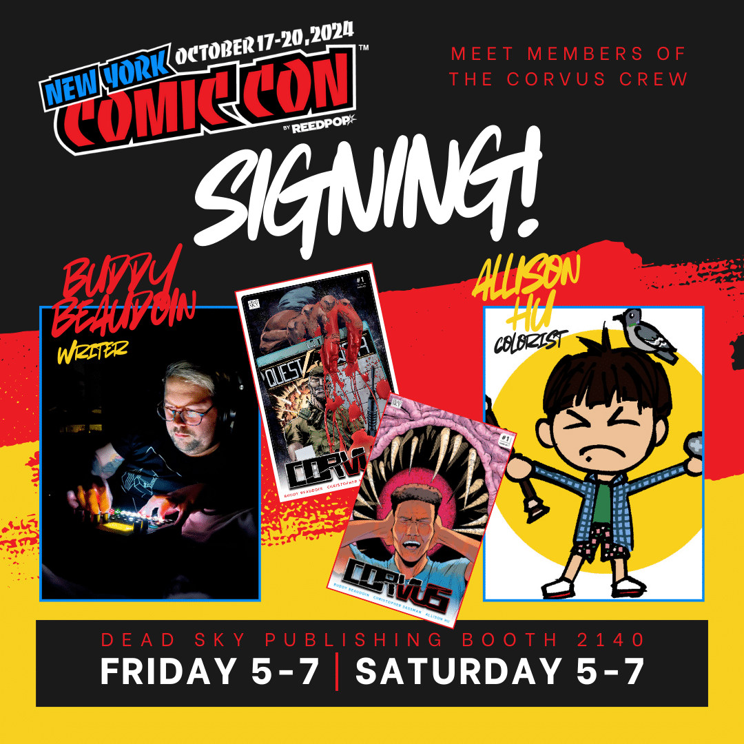 The publisher will be providing FREE COMICS Thursday, Oct. 17th and the Corvus creative team will be signing Friday and Saturday at the Dead Sky Publishing booth from 5 – 7 p.m.
