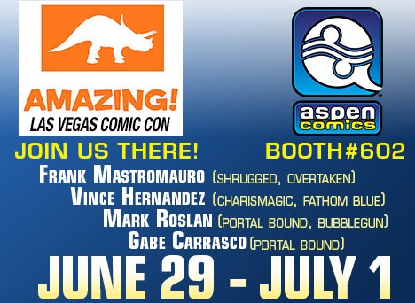Aspen creators Frank Mastromauro (Shrugged, Overtaken), Vince Hernandez (Michael Turner’s Fathom: Kiani, Charismagic), Mark Roslan (Portal Bound, BubbleGun) and Gabe Carrasco (Portal Bound) will be appearing at the Aspen Comics Booth #602.