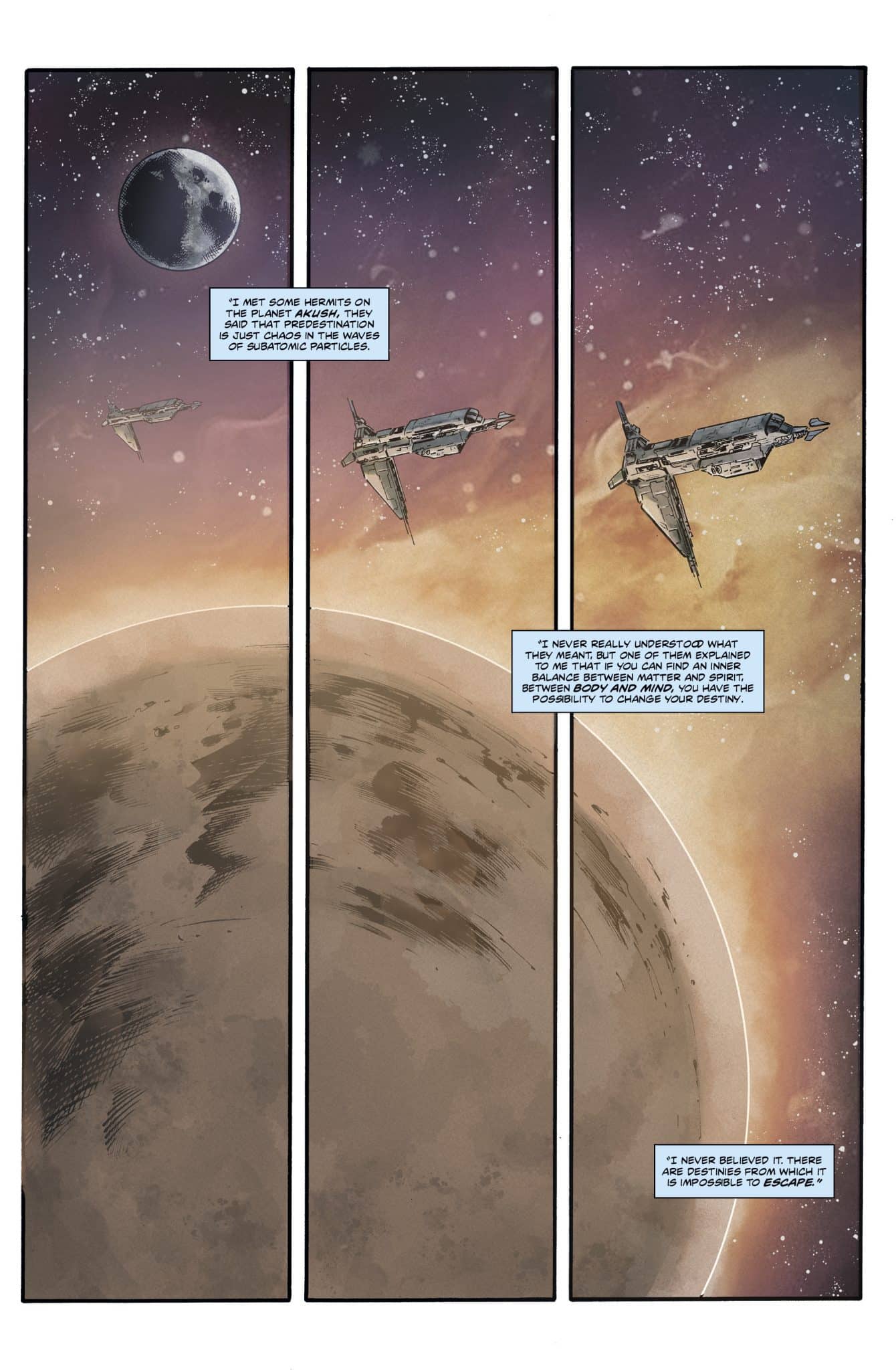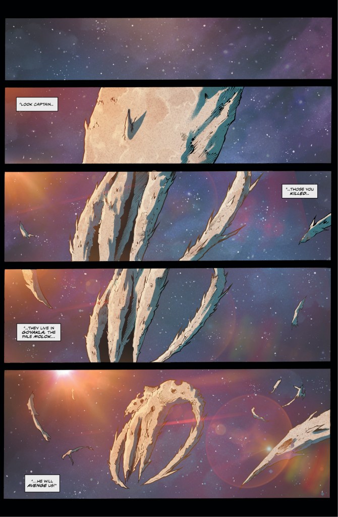 The art by Mutti is excellent. It’s not too surprising as we’ve seen over and over what to expect. The initial battle looks epic in scope, to the point I hope we see more in flashbacks. The frustration of so many feels very real as you can see it in their body language and faces. The guards feel sleezy just looking at them. It’s all fantastic visuals that balance the fantastical and the grounded.