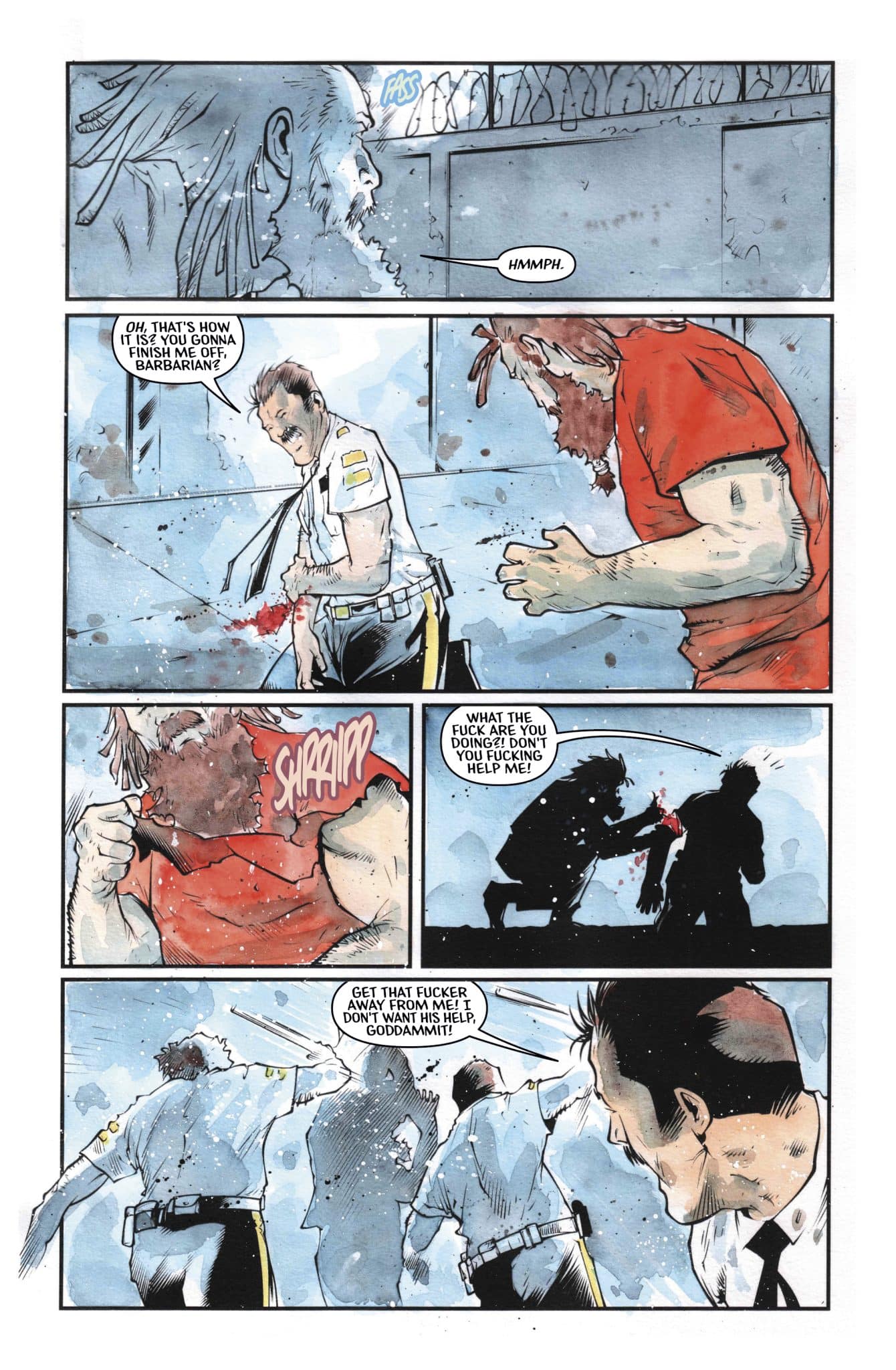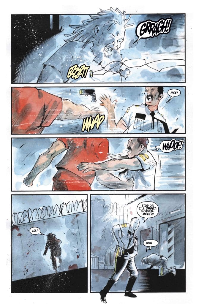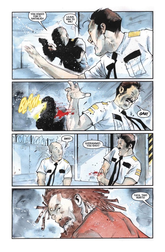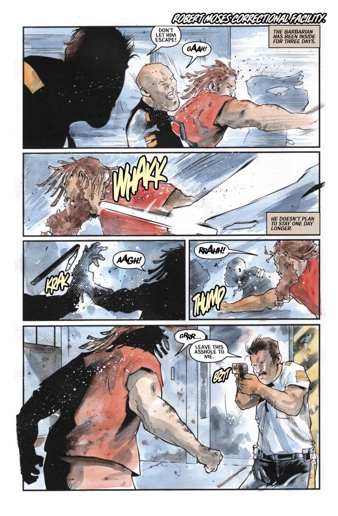 It’s no surprise that I’d enjoy Barbarian Behind Bars #1. Written by Elliott Kalan, art by Andrea Mutti, and lettering by Taylor Esposito, it’s the team behind Maniac of New York, a series published by Aftershock that I loved and hope we get more of. And honestly, Barbarian Behind Bars #1 feels like a series that would have been released by that publisher.