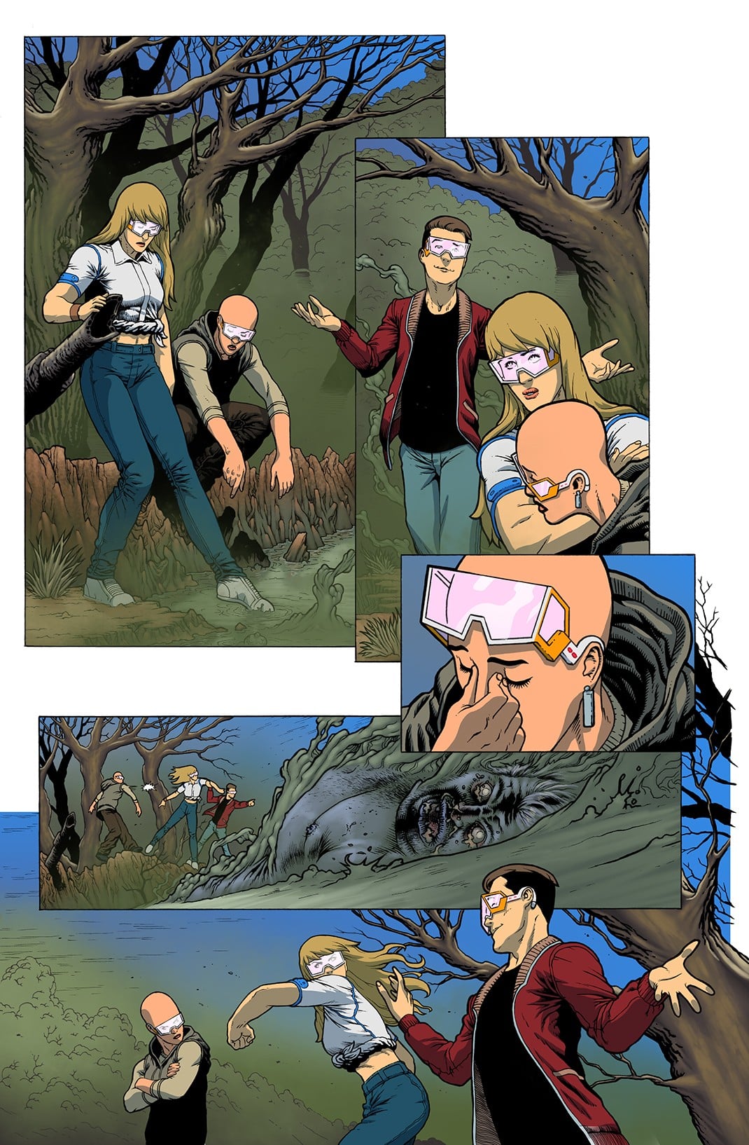 JE: Well as an artist who grew up on superhero comics, I’d be lying if I said I didn’t make changes to my process. There are no capes, no superpowers, no fistfights. All of which I love! But that wasn’t what this story was about. “A Dangerous Lesson” is about interpersonal connections and relationships. It’s about showing what might happen if we achieve the ambitious goal of a brighter, cleaner, more beautiful tomorrow. And to be fair, I haven’t strictly stayed in the superhero genre my entire career. I have worked up stories that range from noir, horror, hard-boiled detective thrillers, to choose-your-own-adventure-style stories depicting a post-apocalyptic end of the world. So having that range served me well on this project. I wanted to focus on the person-to-person dynamics, the subtleties. And from the beginning of the layouts stage, I was focused in that direction. I also had to change up my visual style a bit. I like to abstract, or cartoon my figures a little bit if the project is a superhero story. I switch over into a bit more of the dynamic figure for my superhero projects. But with “A Dangerous Lesson,” I wanted to give the characters normal proportions. Which is a subtle change, but it’s there. It was actually one of the more enjoyable parts for me. I rarely get to draw a more realistic figure, I rarely get to do a non-superhero story, so the change of pace was fun!