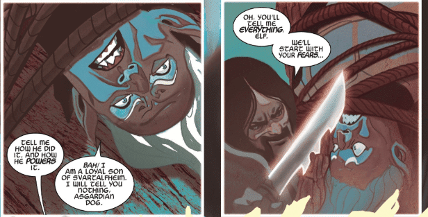 War Scrolls is really one of the “War of the Realms” tie-ins that I wish got more than three issues, especially when we’re blessed with a trio of stories that like we got in issue two. First up is the part two of Jason Aaron, Andrea Sorrentino, and Matthew Wilson’s Daredevil, God of Fear serial, which cosmic sizes a classic battle between Daredevil and the Kingpin. But, before things go from Netflix to Man of Steel, Aaron and Sorrentino do some chilling characterization in a Ben-Day dot flashback where Daredevil prays that he won’t beat a mass murderer to death. Wilson’ color palette switch from flat and old school to majestic fantasy mode helps the story keep its momentum, and although he’s a bad guy, it’s fun to see Wilson Fisk get one up on Malekith and the Dark Elves.