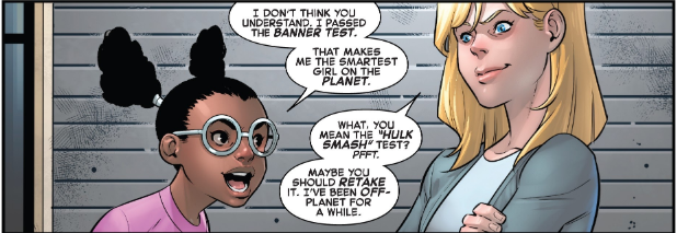 I love how Slott writes Franklin and Valeria as ungrateful adolescents and not just cute kids with big brains and godlike powers. Franklin’s almost limitless superpowers have gone to his head, and it’s nice to see some of the kids in the neighborhood cut him down to size when he brags about his abilities instead of helping with art classes at the Grimm Community Center. However, this story nails the awkwardness of moving to a new area when you’re a kid, getting used to new people, and ways of doing things. It also shows that New York didn’t roll over when Malekith invaded, and best of all, introduces a friendship/rivalry between Moon Girl and Valeria that I hope gets fleshed out in future issues. Most of “War of the Realms” has involved street level heroes fighting cosmic threats, but Slott, Medina, and Libanda turn the tables and have the Fantastic Four protecting their neighborhood. This earns Fantastic Four #10 an Overall Verdict of Buy.