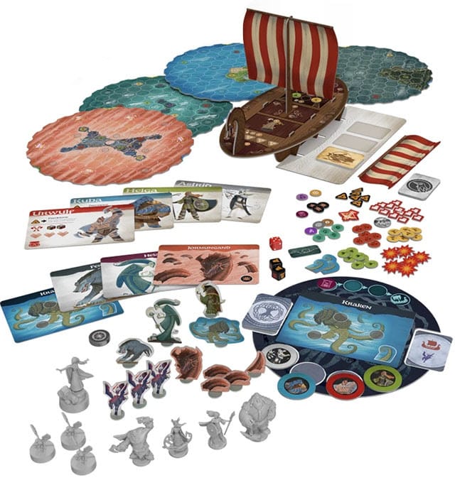 The contents of the standard version include the 3D Drakkar, 2 sails, a compass, 4 miniatures with magnet, 4 heroes and 8 enemies standees, Hero and Enemy sheets, 4 game boards, 43 cards (Fate, Enemy, World, Help of the Gods), Fate and Help of the Gods boars, and over 70 counters, markers and tokens. The Kickstarter Edition will feature miniatures for the heroes and several premium components to be unlocked during the campaign, to make the game even richer and more exciting. The project will present funding goals for the most important funding milestones, and a series of daily missions related to social goals.