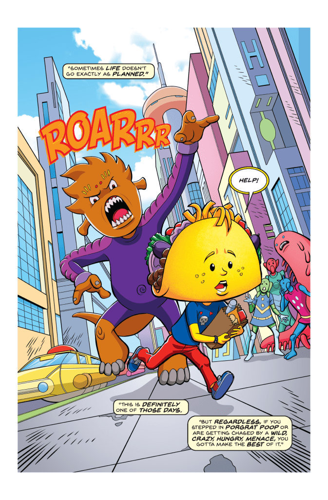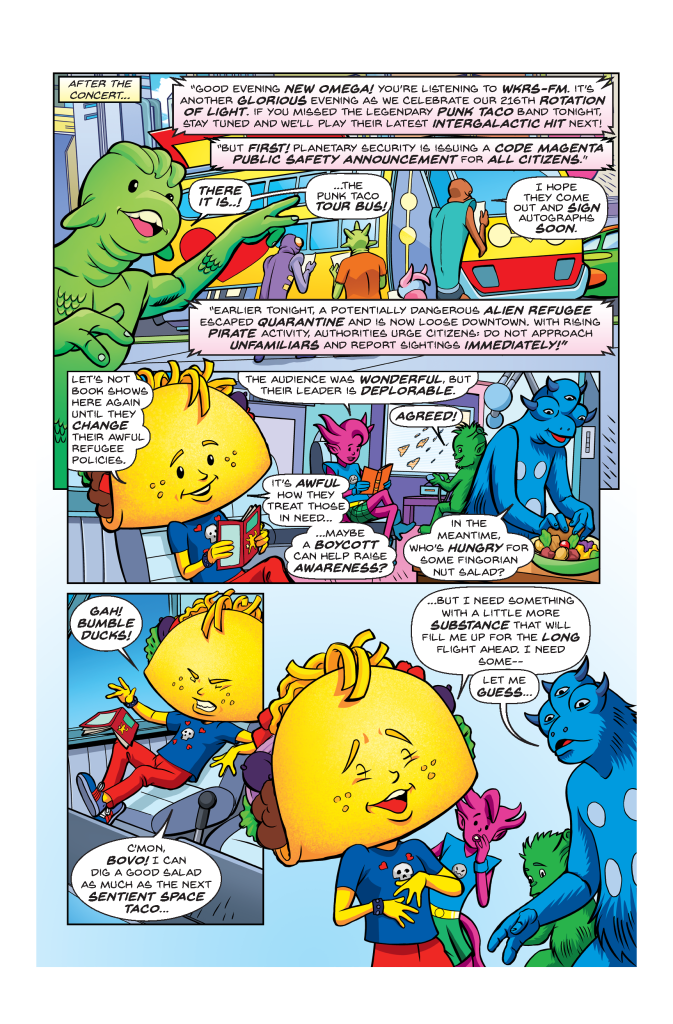 Punk Taco and his band of misfits, rock out across the universe, spreading peace and love through music, while helping those in need, making friends and always trying to do the right thing against impossible odds. For fans of InvestiGATORS and Hilda.
