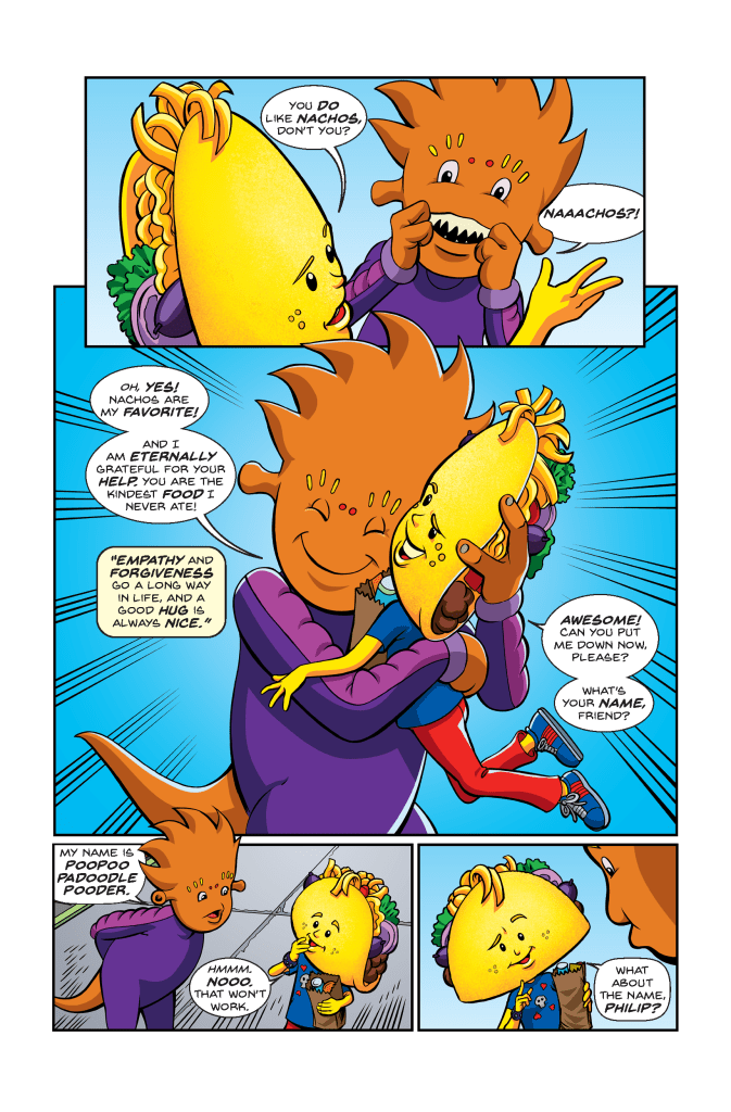 PUNK TACO is a loveable space-taco who rocks out across the universe with his band, spreading peace and love through music. Along the way, they seem to always get into a bit of trouble while helping those in need and doing the right thing against impossible odds. In this brand-new collection of stories, PUNK TACO and the band will do battle against the evil King Boogar, to help reunite their new friend, Philip, with his family, while discovering the mysterious, magical powers of the Evocaja. PLUS two bonus stories that have PUNK TACO experiencing big feelings and sharing his love for art with his friend, Bash. Featuring art by Makana Wallenta, Scott Chantler, Rich Koslowski, DJ JS-1, Chuck D (Public Enemy), Mike Cavallaro, Art Baltazar, Frano and more!