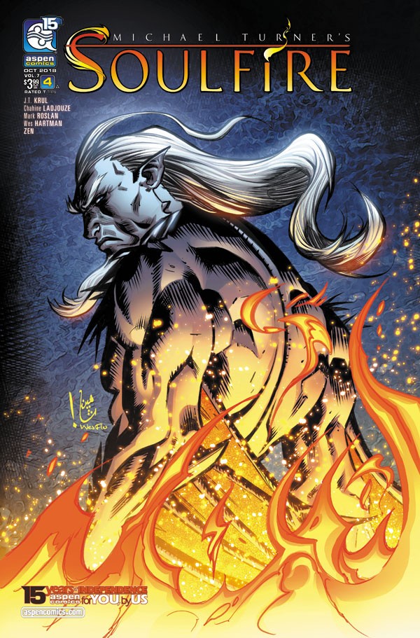 Michael Turner and Aspen Comics’ flagship title commemorates its landmark fifteenth year and the creative team of long time Soulfire writer J.T. Krul (Teen Titans, Jirni), newcomer Chahine Ladjouze, and colorist Wes Hartman have joined forces to bring new readers as well as loyal fans alike a Soulfire story for the next generation!