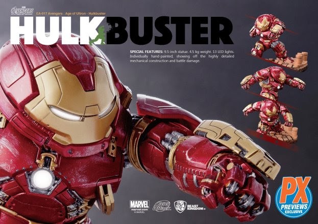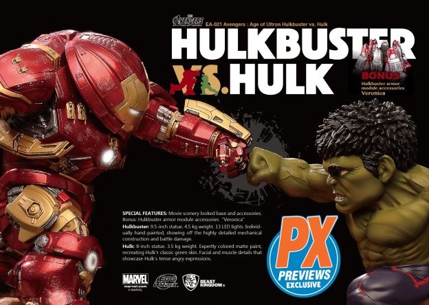 ThePREVIEWS Exclusive EA-021 Avengers: Age of Ultron – Hulkbuster vs. Hulk (AUG198199; SRP $399.99) and EA-017 Avengers: Age of Ultron Hulkbuster (AUG198198; SRP $234.99) statues are now available for pre-order at comic shops, with an expected release date of May 27, 2020.