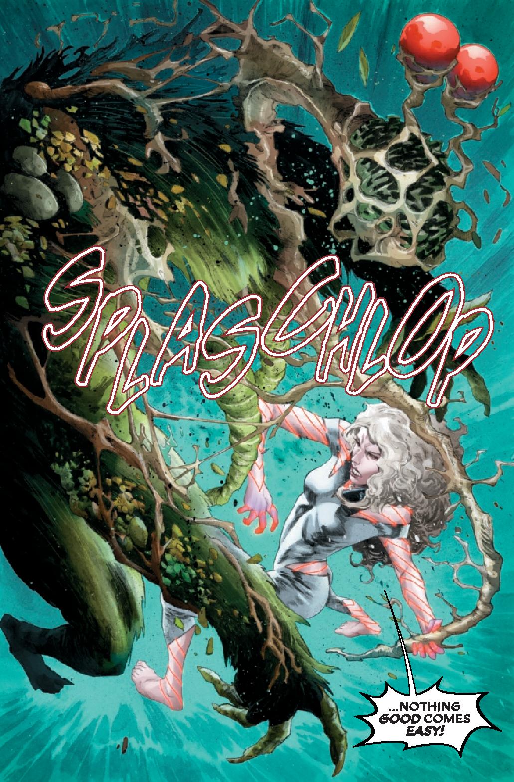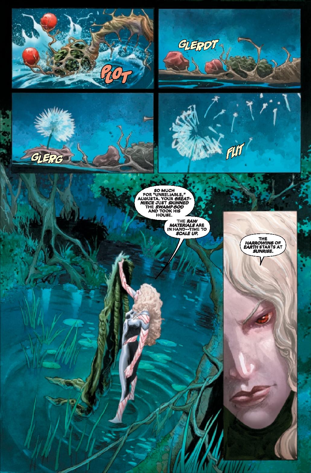 Written by Steve Orlando, the comic kicks off with unexpected characters in Hordeculture, a group of zealot botanists that were introduced in the rebooted X-Men line. The group has a goal of depopulation, though not total destruction, of humanity to better balance the world. And while they’re extreme, there’s always someone more extreme. Enter Harrower who wants to mix science and magic to make the world better, putting her in conflict with Hordeculture. Harrower has a plan, and that’s to use Man-Thing to bring about her vision for the world.