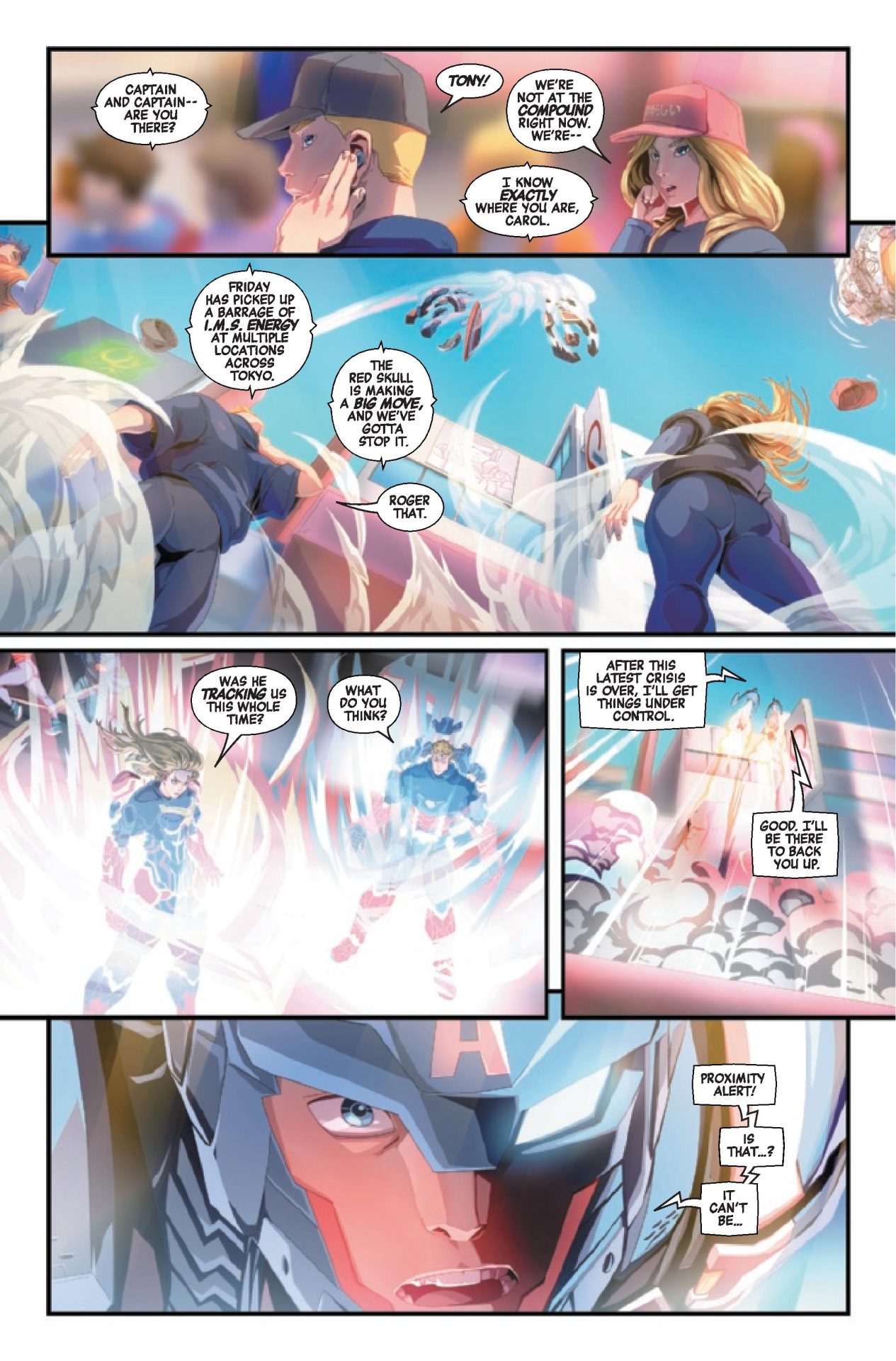 Written by Jim Zub, Avengers: Tech-On #2 continues the battle for the struggling Avengers. Red Skull has used shards of Infinity Stones to gain more power and stripped the heroes of their powers. This forces Iron Man to equip the team with their own suits of armor also powered by the same energy as the Red Skull.