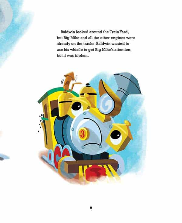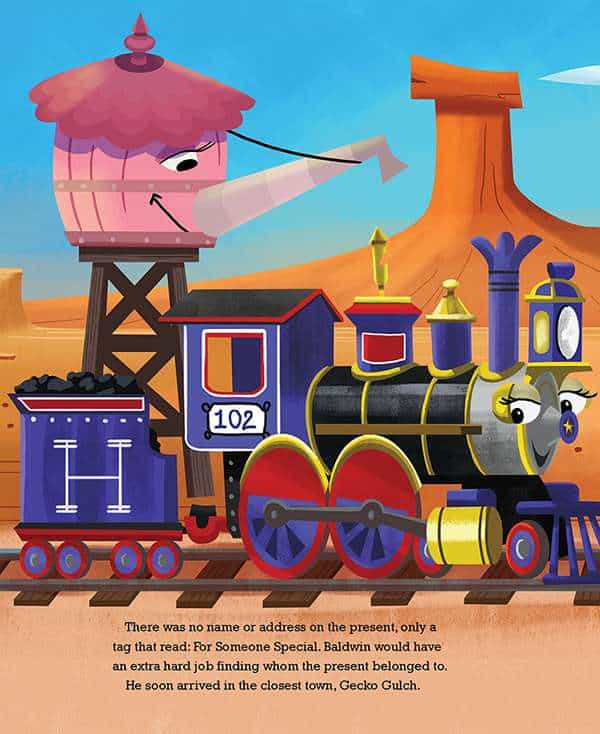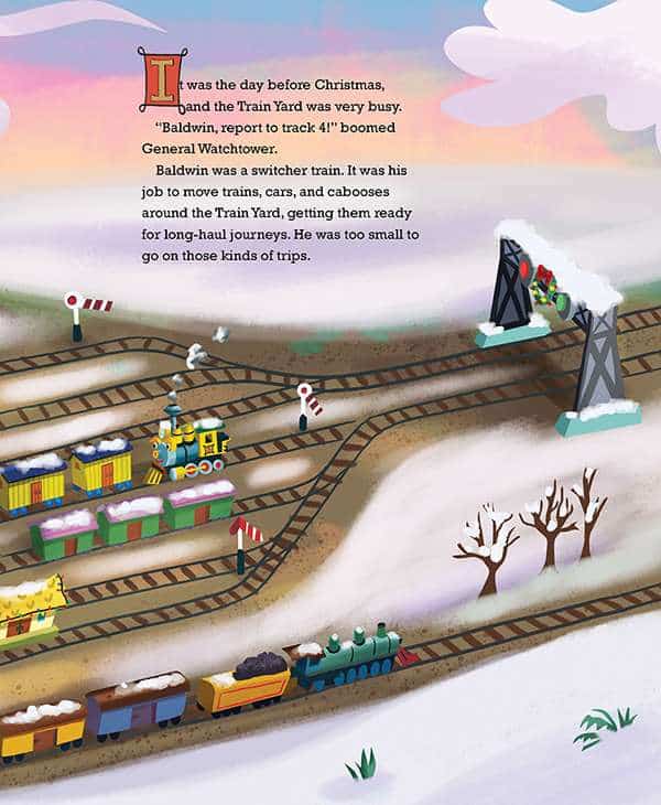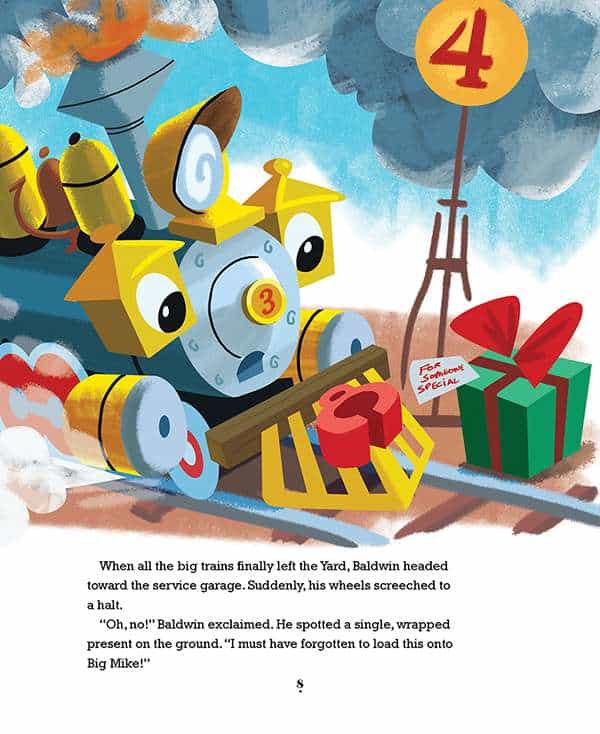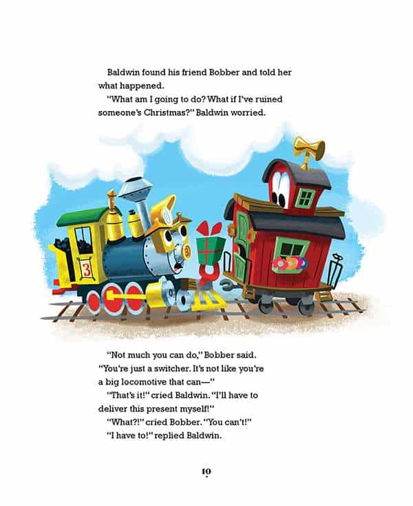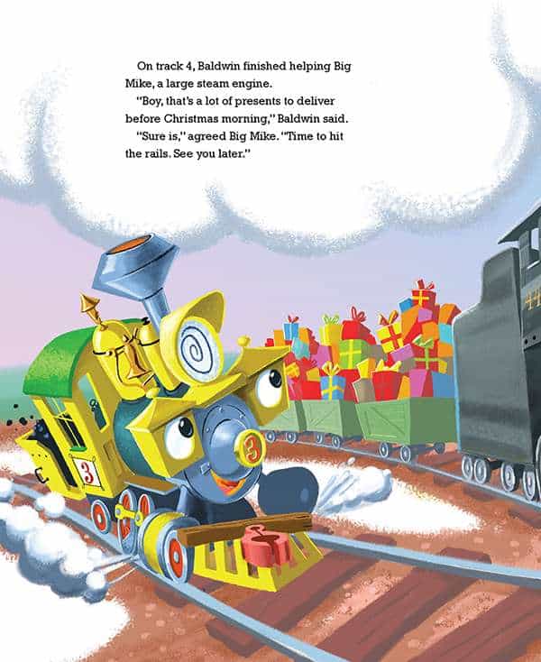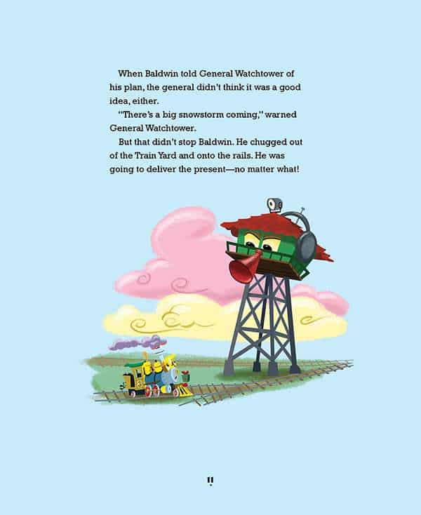 It’s Christmas and the train yard is busy! There are lots of trains with lots of packages to deliver. Baldwin, a switcher train, does his best to get all the big trains ready. But when he discovers one Christmas package that’s been left behind, Baldwin decides he must deliver the package himself — no matter what!