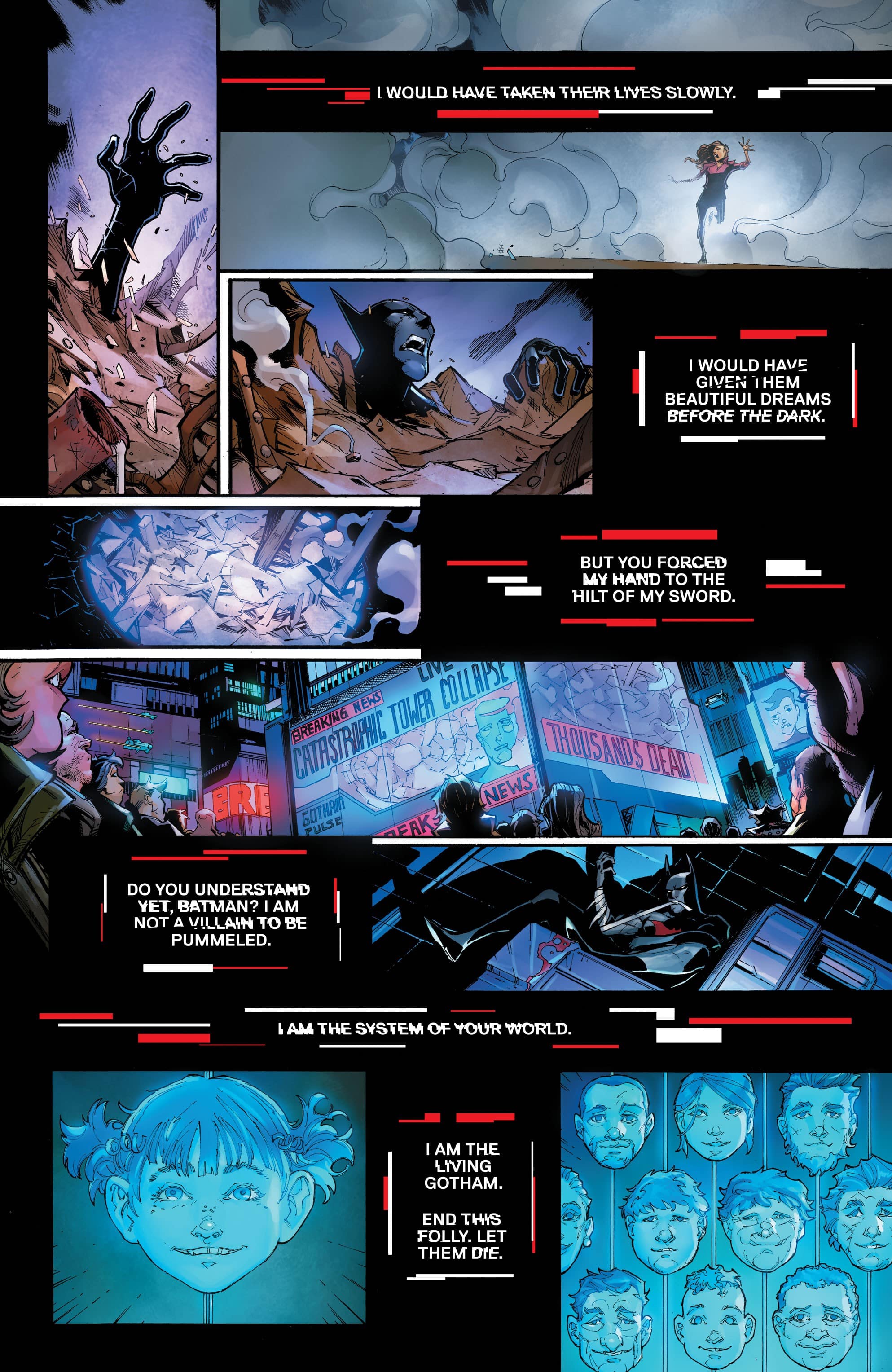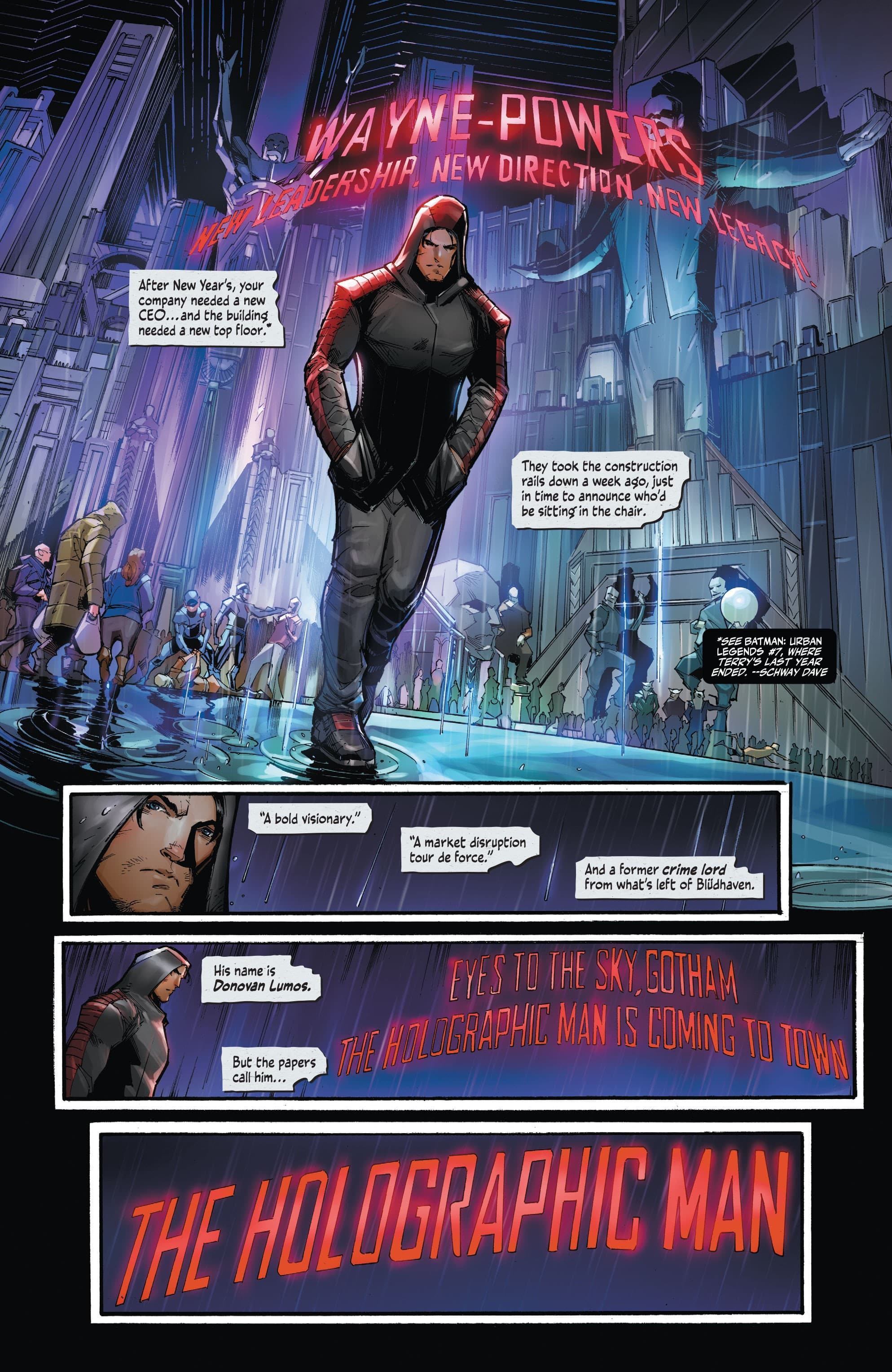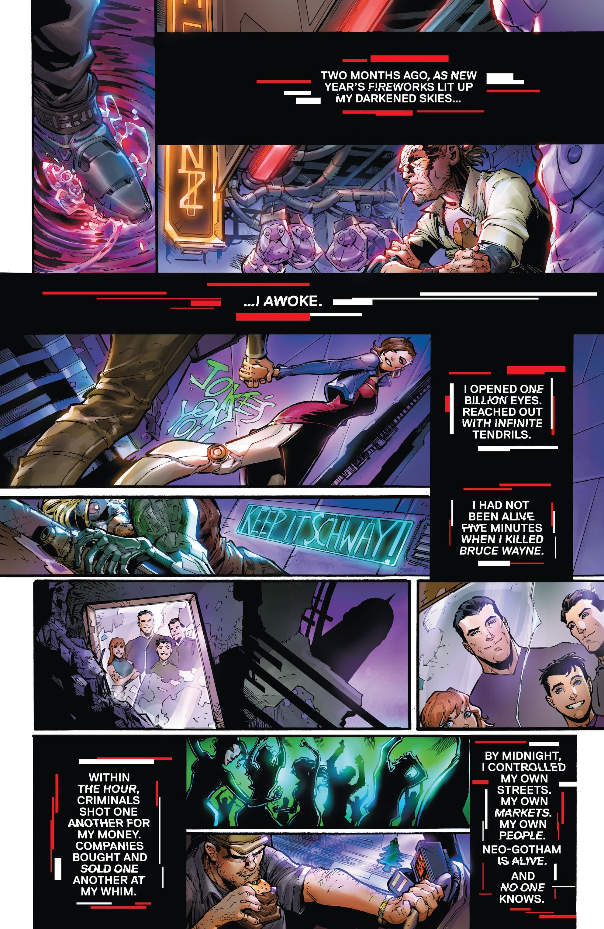 It feels like there’s a lot thrown into Batman Beyond: Neo Year #1, any bit could easily be a story by itself. A questionable CEO taking over Wayne-Powers. Gotham awakening and becoming a threat to itself. Just the general unrest post Bruce. Any of it could be a hell of story but here it’s all packed in together for a start that feels a little muddled but with a lot of potential.