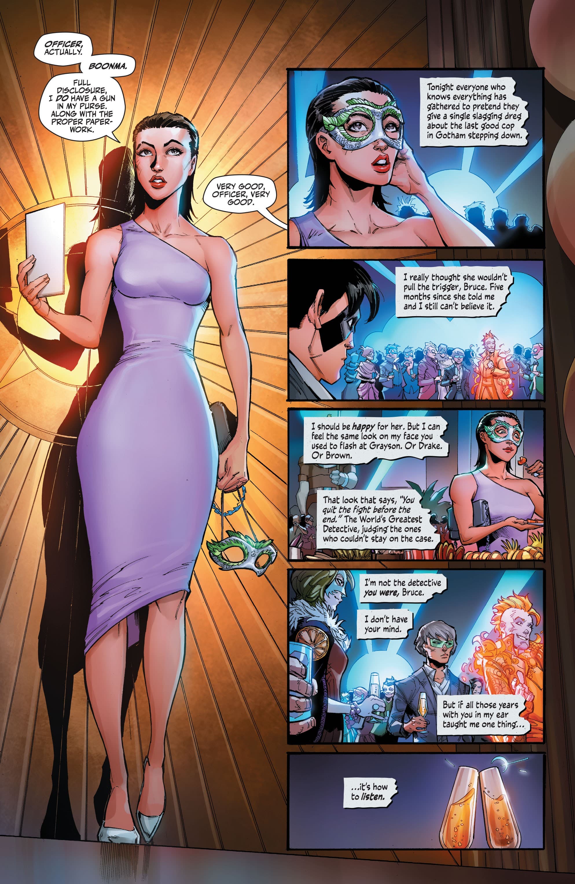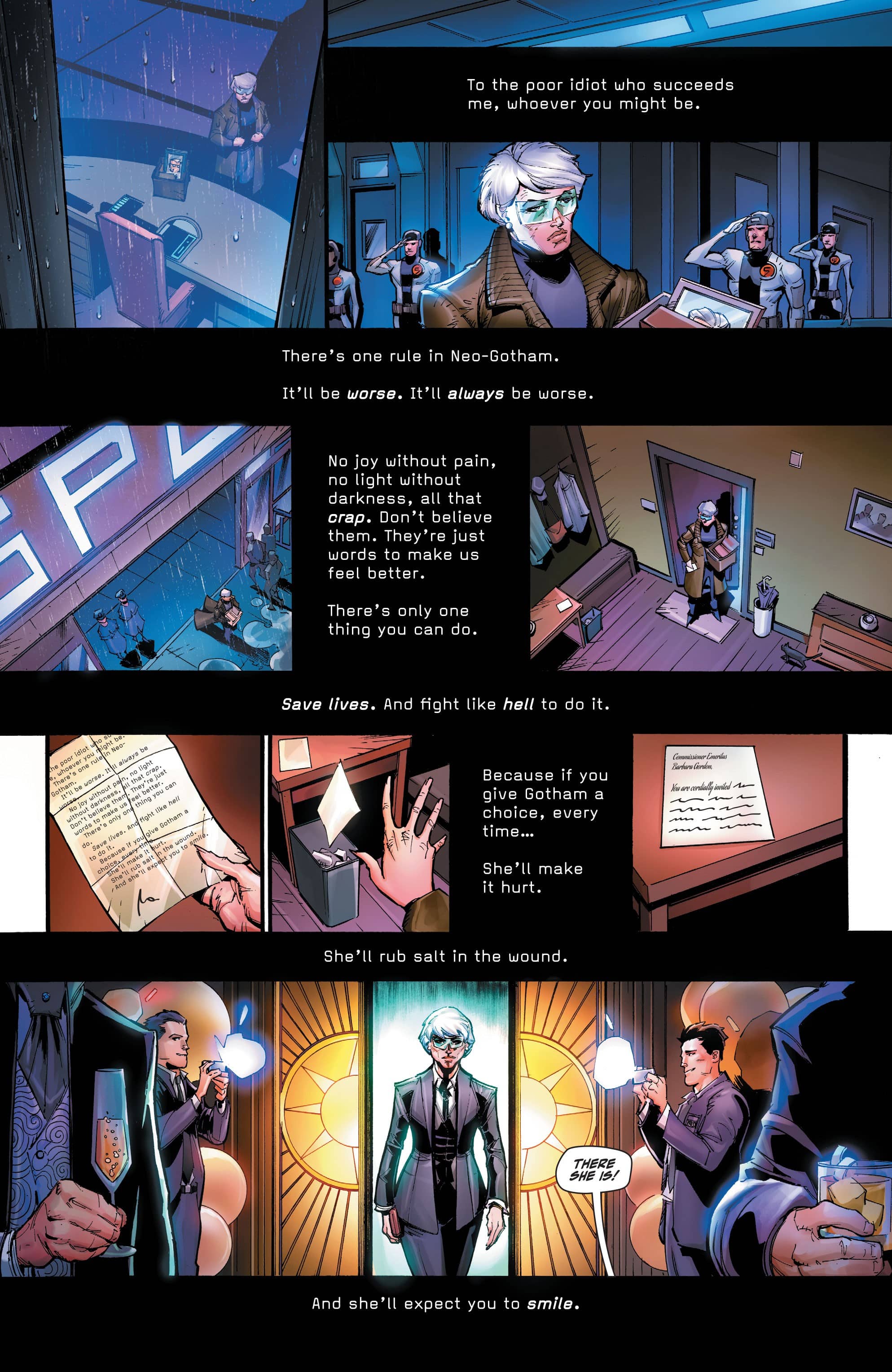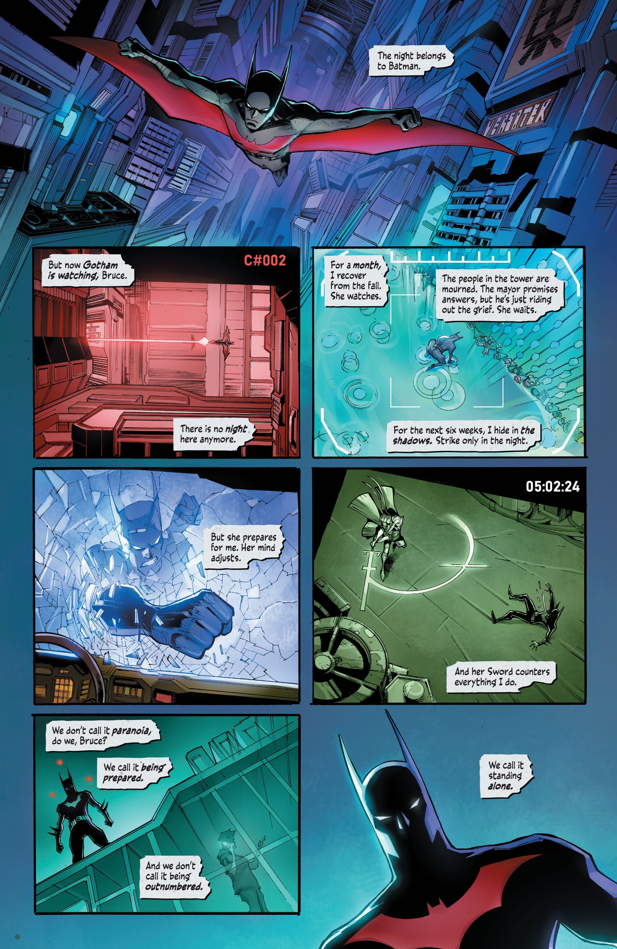 The art by Max Dunbar is pretty solid. With color by Sebastian Cheng and lettering by Aditya Bidikar, the comic looks nice with a futuristic vibe that reminds me of the neon Gotham of “Future State” but with a bit grimier tinge to it. The characters and designs look great delivering a future aesthetic that doesn’t feel like too much of a shift and break from the current Batman series but still feels futuristic. There’s some panels and pages that I lingered on to figure out what’s going on but that weirdly also played into my general take reading the story at times.