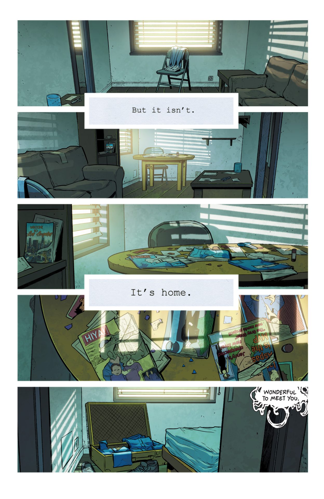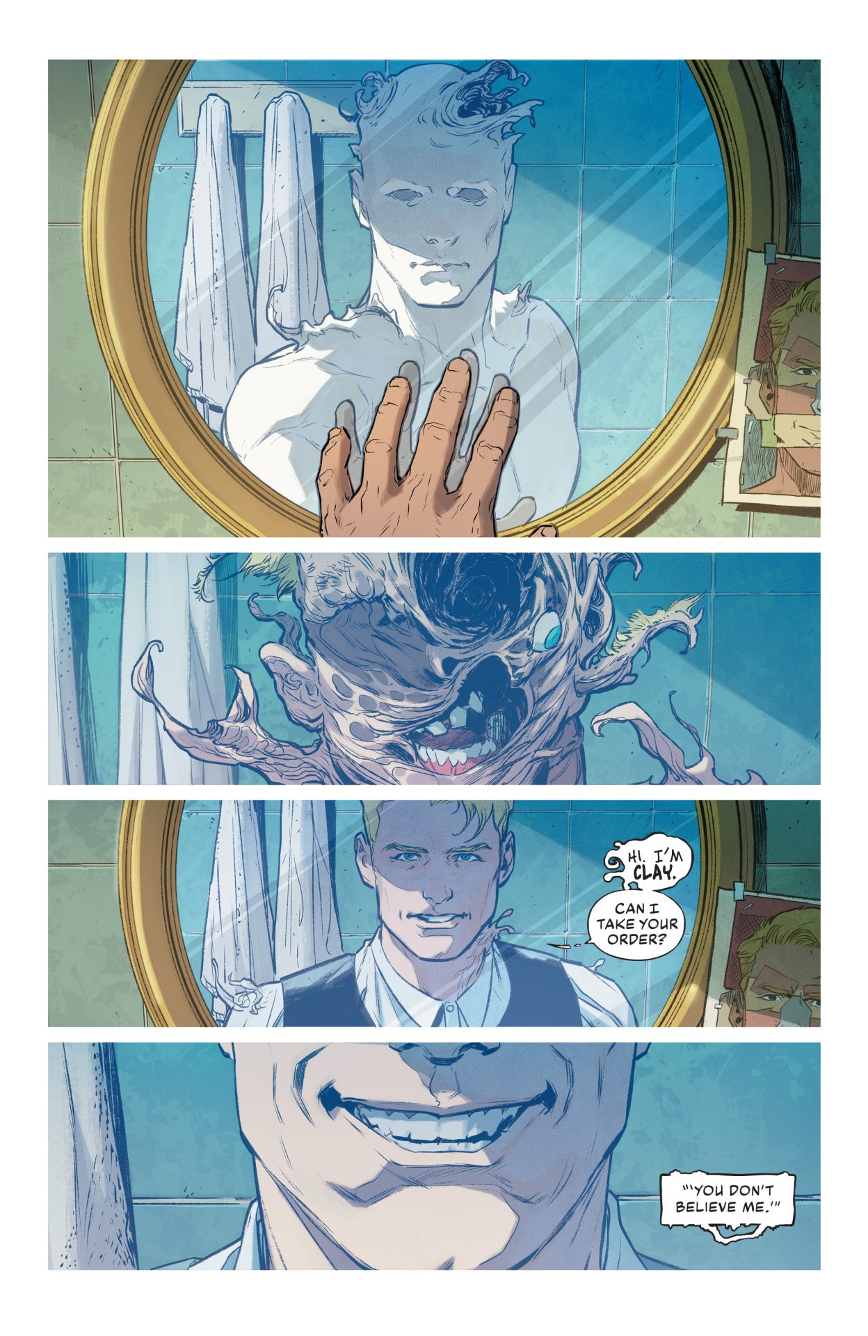 The art by Xermánico is fantastic. With color by Romulo Fajardo Jr. and lettering by Tom Napolitano, the team balances the brightness and dreams of LA with a tinge of horror. Clayface’s actions are frightening, violent, and shows the monster literally exploding at times. That’s matched by the glitz and brightness of the city around him. The lettering also balances that human vs. monster aspect quite well with it all coming together for visuals that help play off of the story’s underlying themes and concepts. They work with and enhance the narrative, a solid match of script and art.