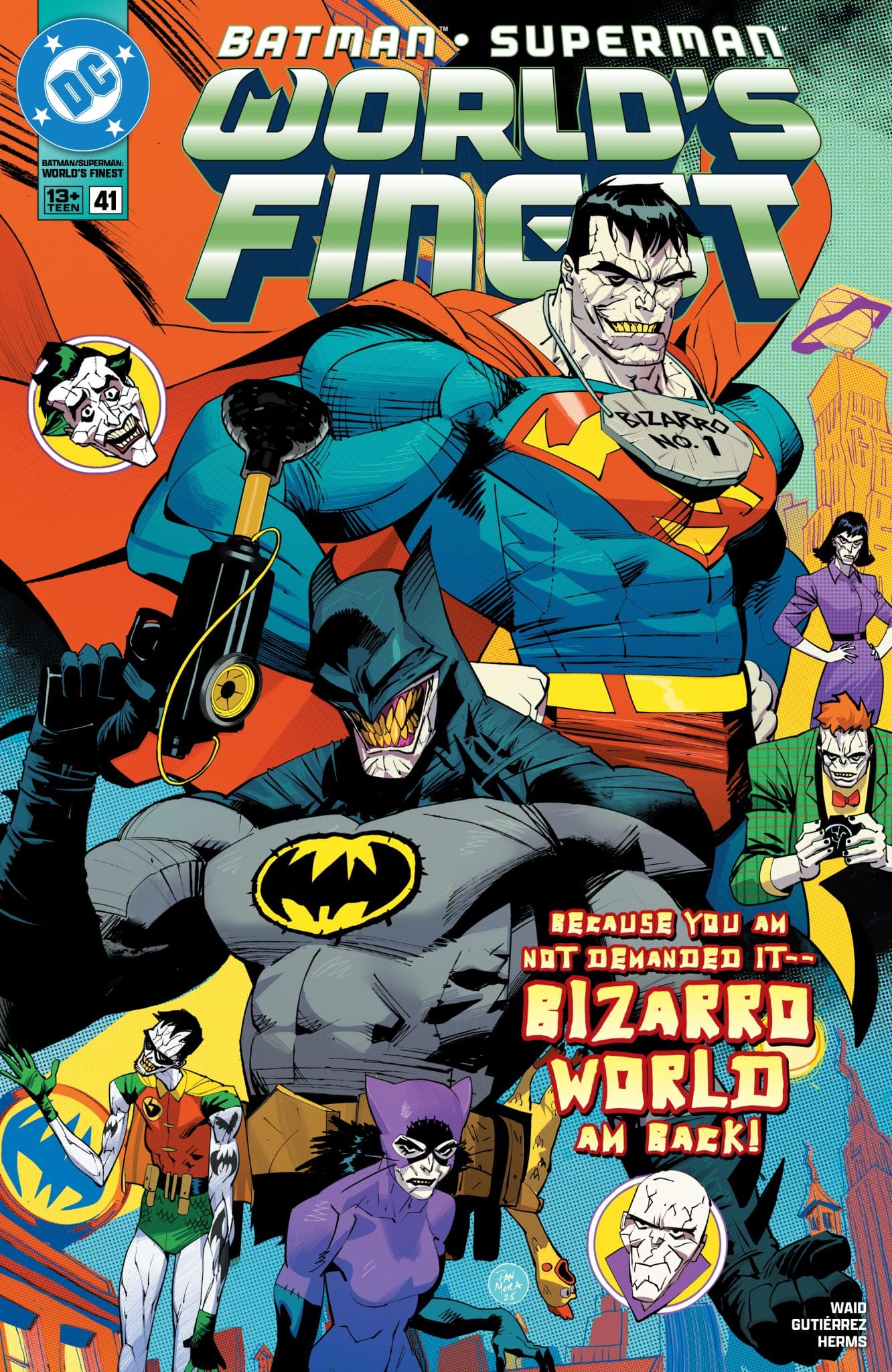 SAY GOODBYE TO BIZARRO WORLD! Up is down, left is right, and red is green–but danger is still danger as Batman and Superman awaken on Bizarro World with no idea how they got there–or why they’re being hunted by one of the most dangerous beings in the universe! Even if they survive, can they find their way home from a backward planet in time to save their friends from danger?