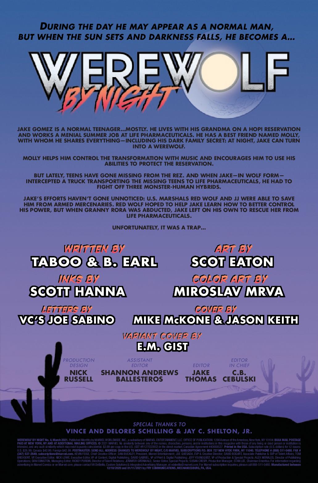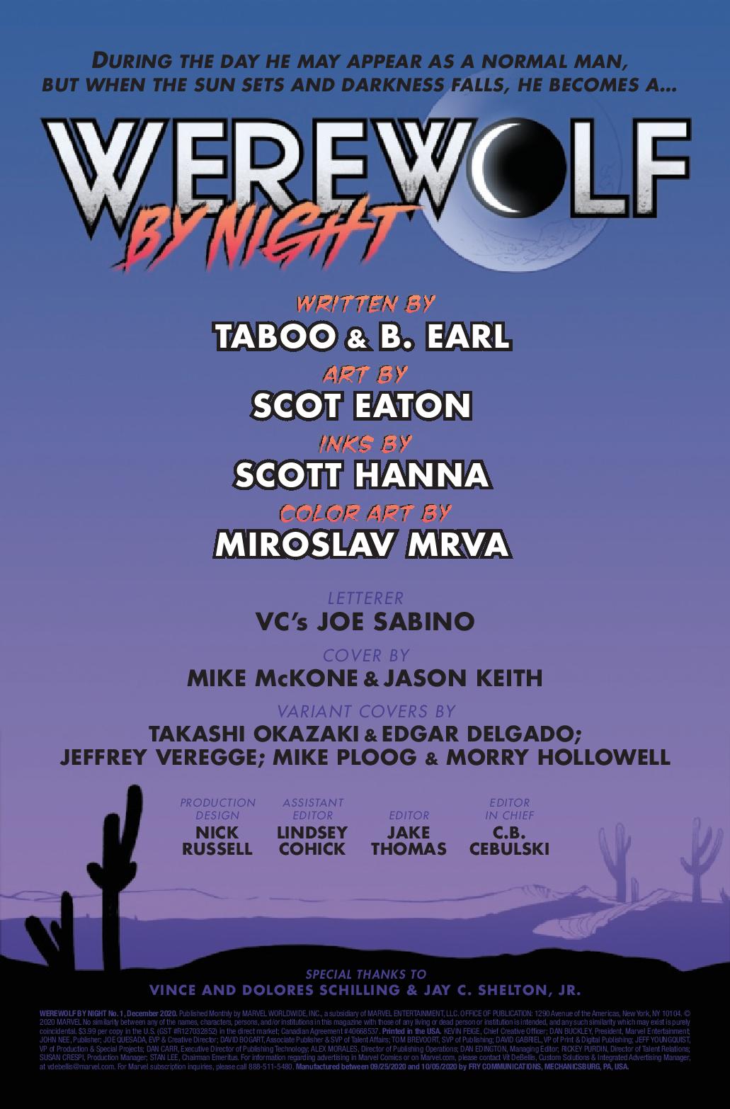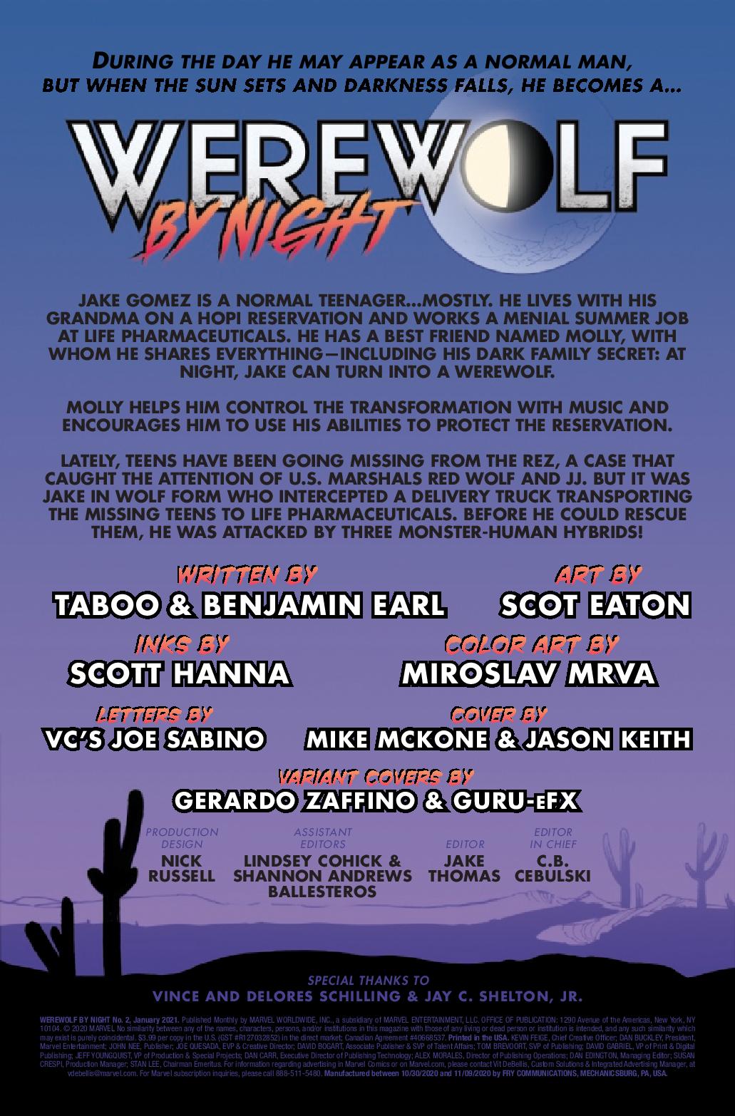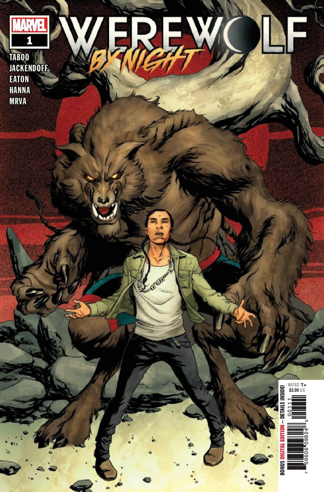 THE HOUR OF THE WOLF! A new Werewolf by Night is prowling the Southwest, but all is not as it seems! A young man, a family curse, and an unholy experiment prove a dangerous combination for a small town in Arizona. All young Jake wants is to protect his people, but who will protect him from the monster within? Taboo of the BLACK EYED PEAS and Benjamin Jackendoff team up with Scot Eaton to tell an epic tale of righteous fury and incredible transformation in the Mighty Marvel Manner that is not to be missed!
