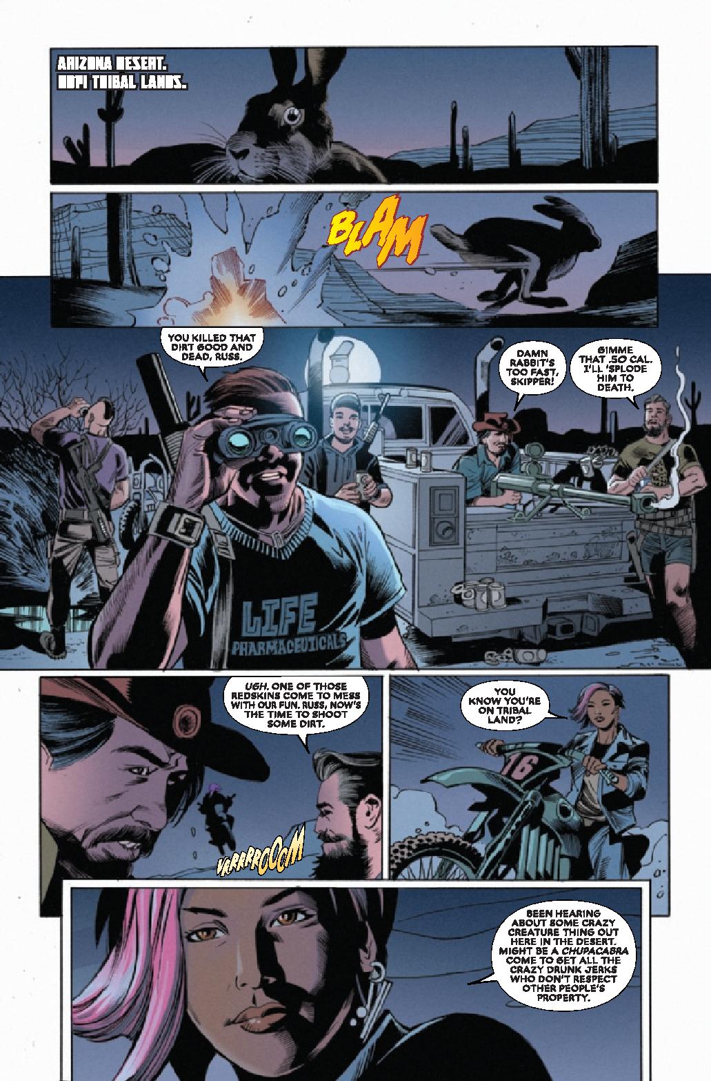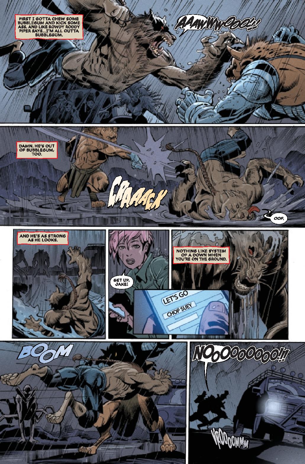 The creative team of Taboo (from the Black Eyed Peas), Benjamin Jackendoff, and Scott Eaton establish these three characters as a tight unit, where the loss of one them would prove catastrophic to their own sense of identity. Granny Rora is the group’s storyteller, the source of the myths and legends that explain Jake’s relationship with his hairier side, if only metaphorically.