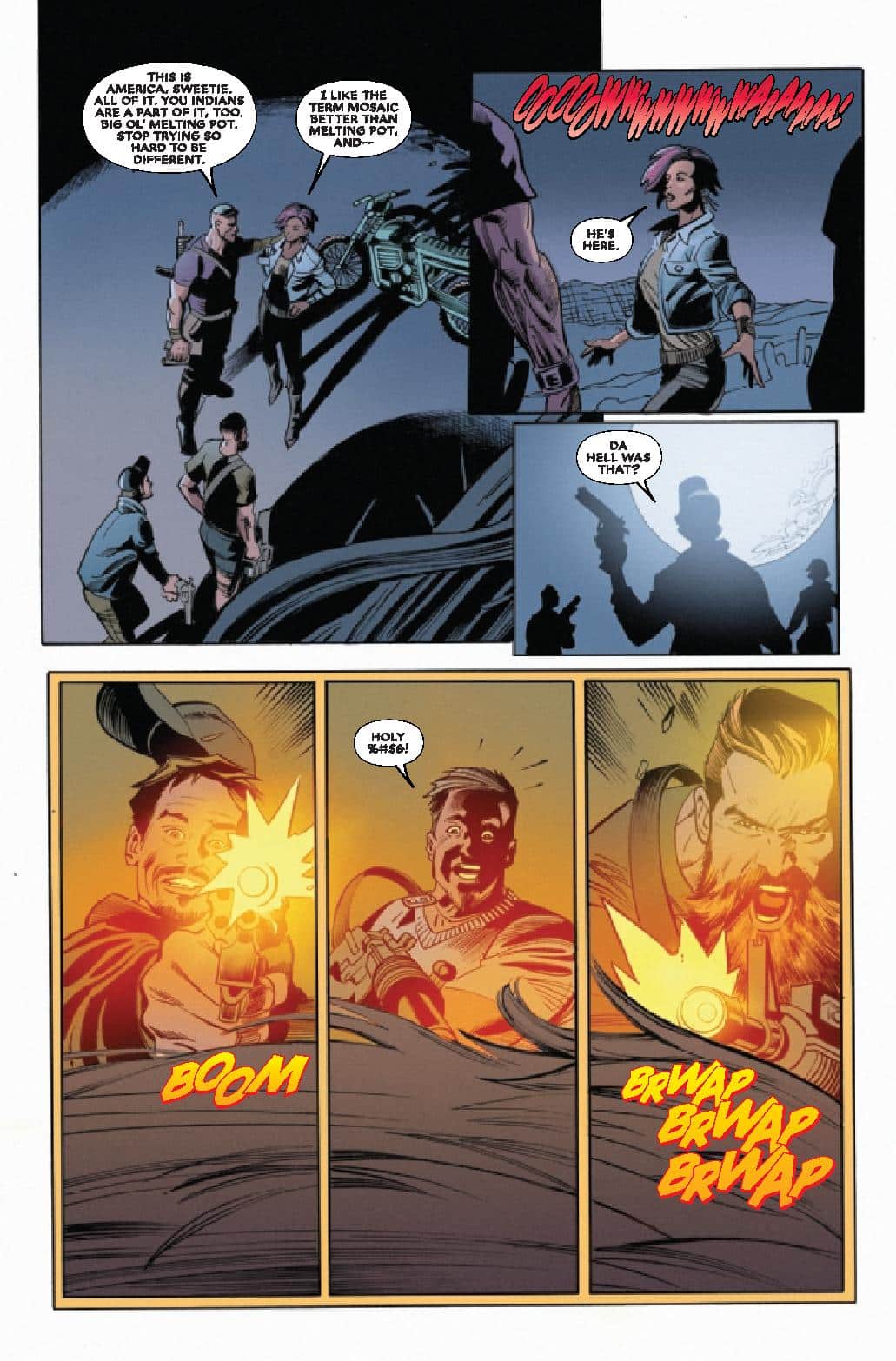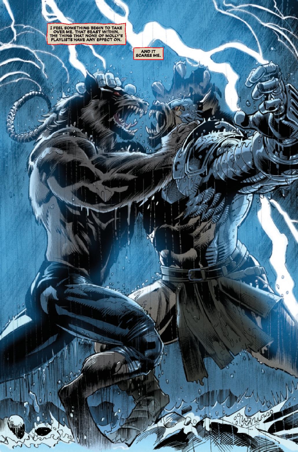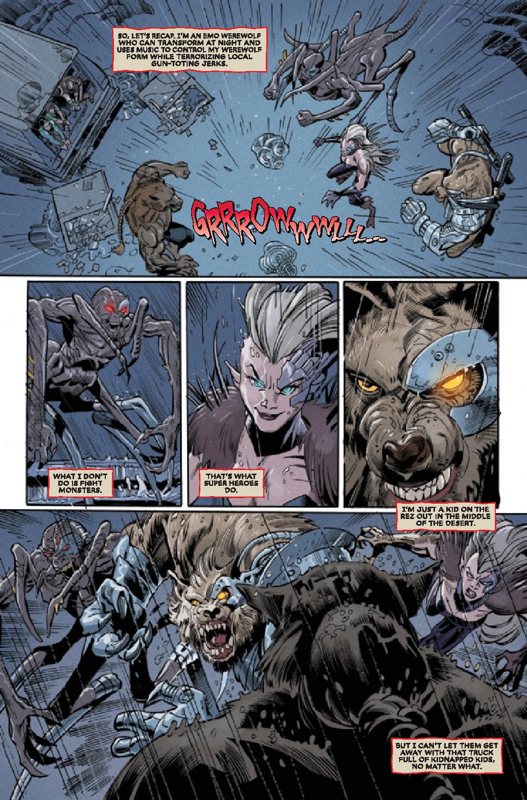 Scott Eaton’s art, on the other hand, does a great job at world building and produces an especially vicious werewolf design. Every scene involving the werewolf carries a ton of violence in it, albeit more figuratively than literally. There’s a force behind it that captures the sheer monstrosity that is a werewolf. Unfortunately, the wolf also has moments when he looks like he’s presenting himself as a viable option for a future Champions or Young Avengers comic. I wouldn’t mind that happening, especially because Native character are still in short supply in mainstream media, but I’d hope they make the character somewhat more unique and compelling in this regard.