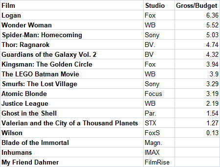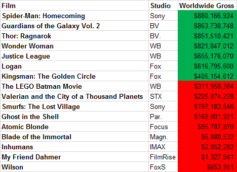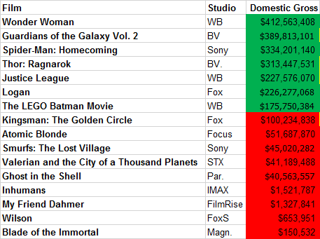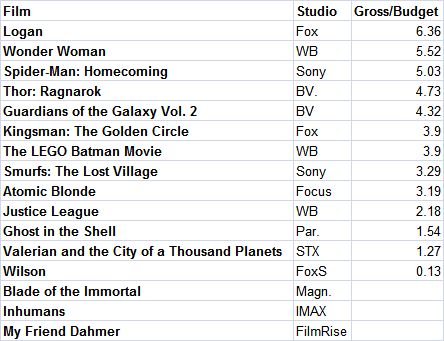 2017 has had five clear successes and a whole lot of mixed otherwise. Thor: Ragnarok, Wonder Woman, Logan, Spider-Man: Homecoming, and Guardians of the Galaxy Vol. 2 have done well this year. My Friend Dahmer, Justice League, Kingsman: The Golden Circle, The LEGO Batman Movie and Smurfs: The Lost Village, and Atomic Blonde are in that debatable area. Valerian, Wilson, Ghost in the Shell, and Blade of the Immortal are generally disappointments. Marvel’s Inhumans… got no clue and tough to debate since it’s a television show primarily with a limited film engagement.