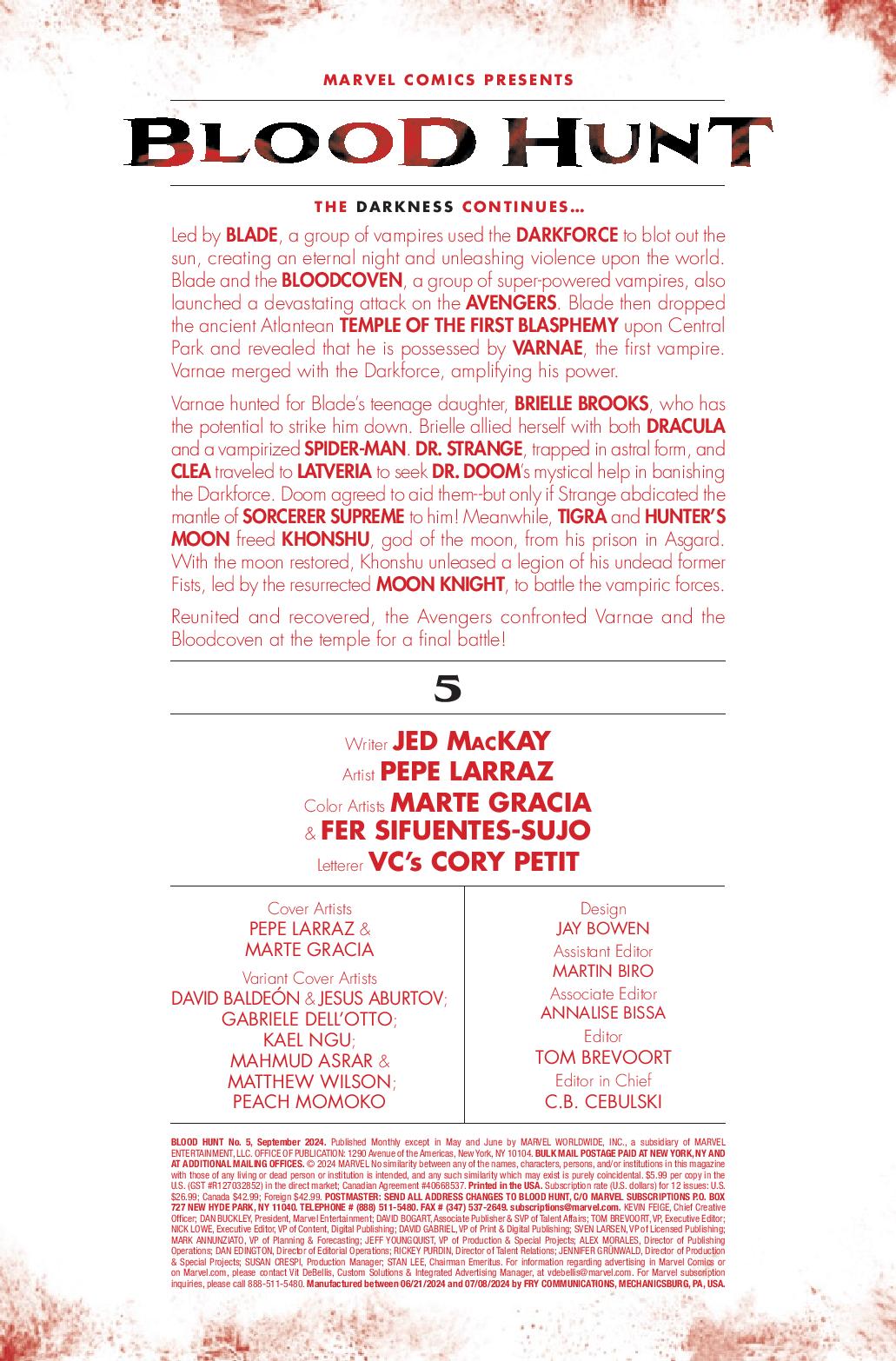 Written by Jed MacKay, Blood Hunt #5 has the Avengers fighting the possessed Blade and his Blood Coven while Doctor Strange wrestles with making a deal with the devil that is Doctor Doom. Both storylines deliver a titanic experience with memorable moments and shocking surprises.