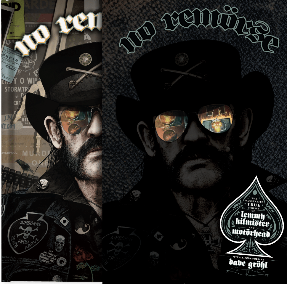 All collector editions will include the oversized deluxe volume of the NO REMORSE: The Illustrated True Stories of Lemmy Kilmister and Motörhead book contained in a metallic foil embossed slipcase, with die cuts that reveal the holographic coating on Lemmy’s classic aviator specs on the cover of the book. All editions available for preorder.