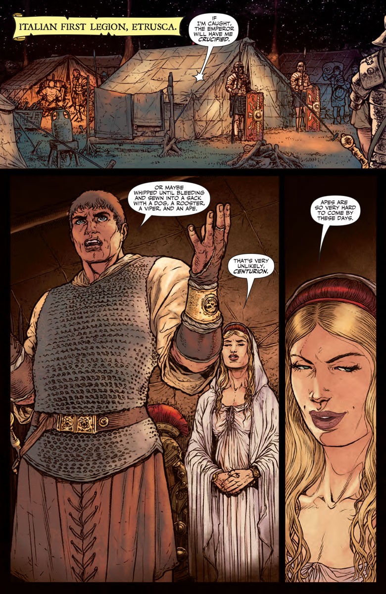 On the other side of Rome, a strange mystery swirls through the Palatine Hill. In the dead of night, down winding alleys, Rome’s elite swear that they see visions of a blood-soaked Apollo walking the city…visions that are driving them mad. Even more are becoming sick with weird fever god-dreams. Panic ensues in the city. The Chief Vestal, Rubria, is arrested by Emperor Nero and threatened with crucifixion unless the deadly curse that’s fallen on Rome is lifted. She asks Antonius Axia, hero of Britannia and Rome’s only detective, for help. She offers only one clue…the gladiator Achillia.