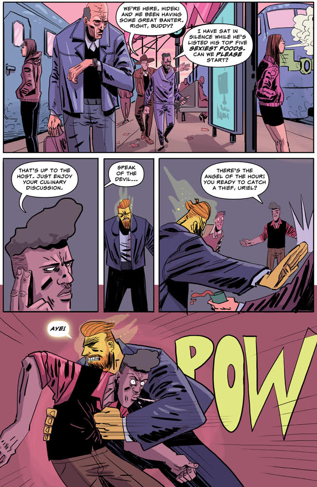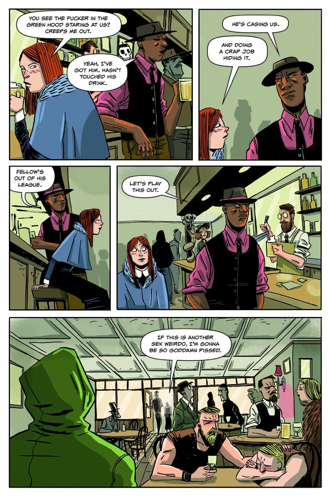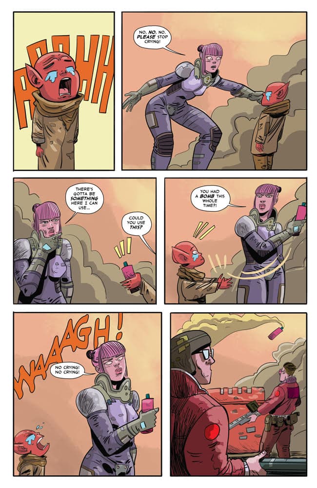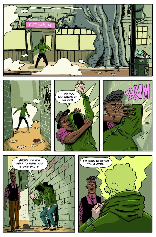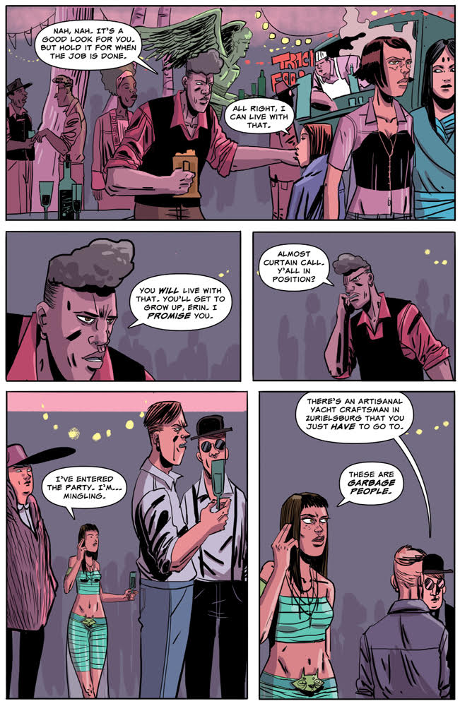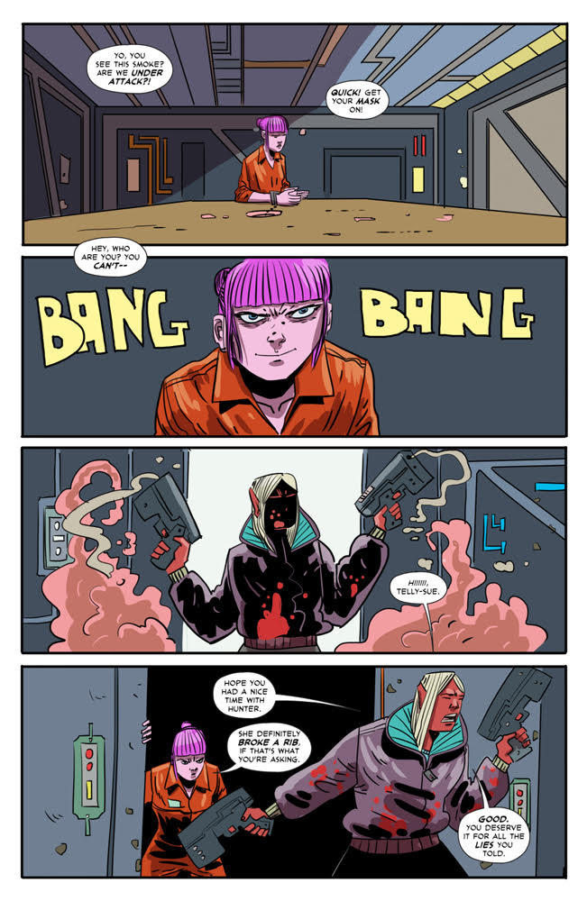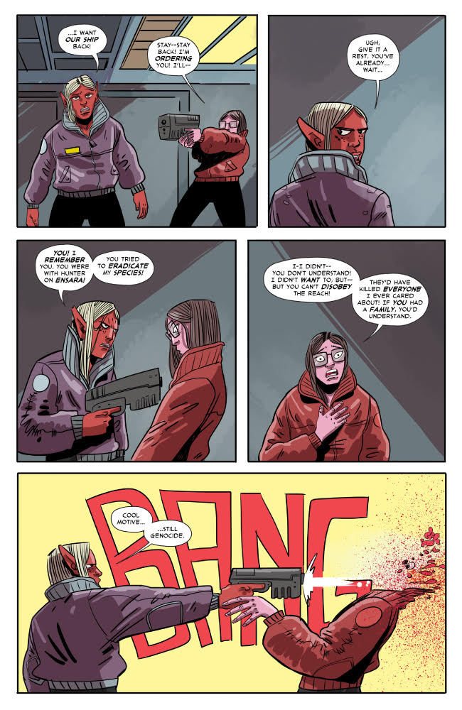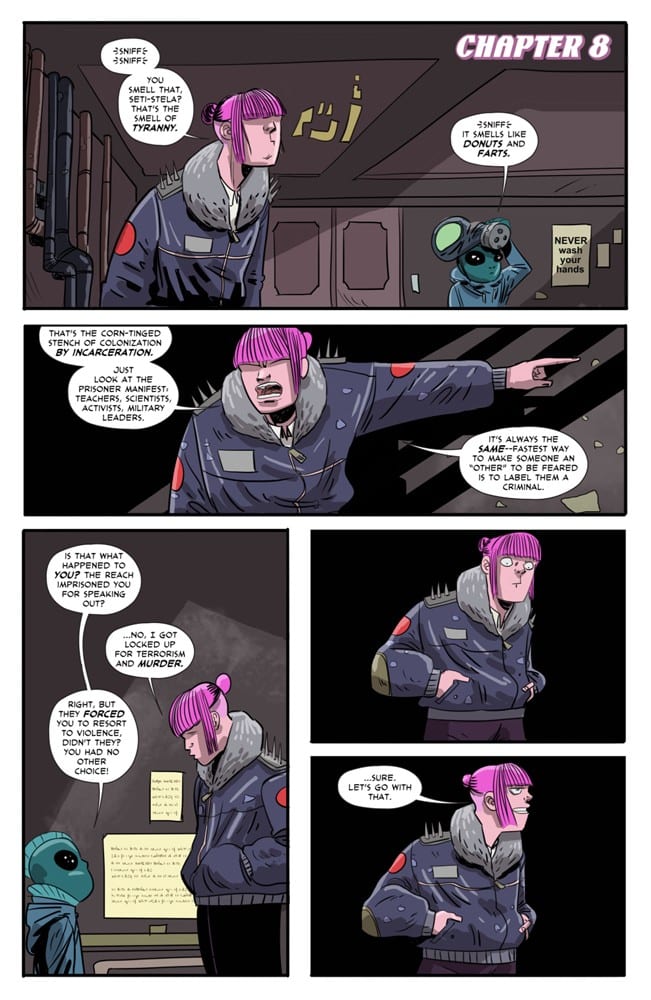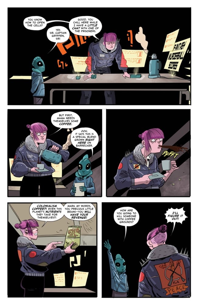 Ben Kahn and Bruno Hidalgo follow up their acclaimed Heavenly Blues with Gryffen: Galaxy’s Most Wanted, a genderqueer space opera following Captain Lyla Gryffen’s campaign against the fascist Sovereign Reach. Once pride of the Reach, Gryffen disappeared six months ago at the edge of the galaxy, only to return one week ago—deeply pissed off. Building a crew from a hostage Reach soldier and the imprisoned smartest man in the universe, Gryffen is out to put a stop to the Reach’s exploitation of worlds, the stagnation of science, and the tyranny of green Jell-O!