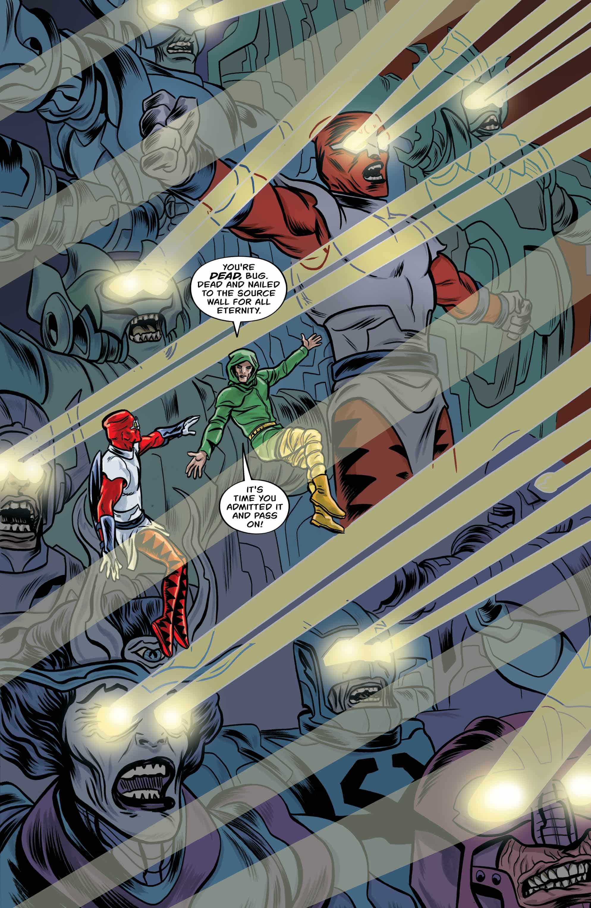 The creative visual metaphors we get are clearly the product of visual storytellers. This story questions social control and the perhaps impossible dream of self determination and freedom. It is rich with references to the full Forth World canon but the visuals are stunning in their own right so newbies will love it. There is so much visual storytelling per page it demands re-reading. I love it. Overall 9.0 Recommendation: Buy it. Frame it.